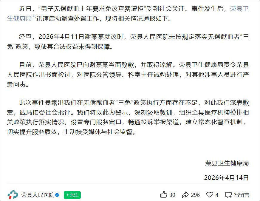 近日,“男子无偿献血十年要求免诊查费遭拒”受到社会关注。事件发生后,荣县卫生健康局迅速启动调查处置工作,现将相关情况通报如下。