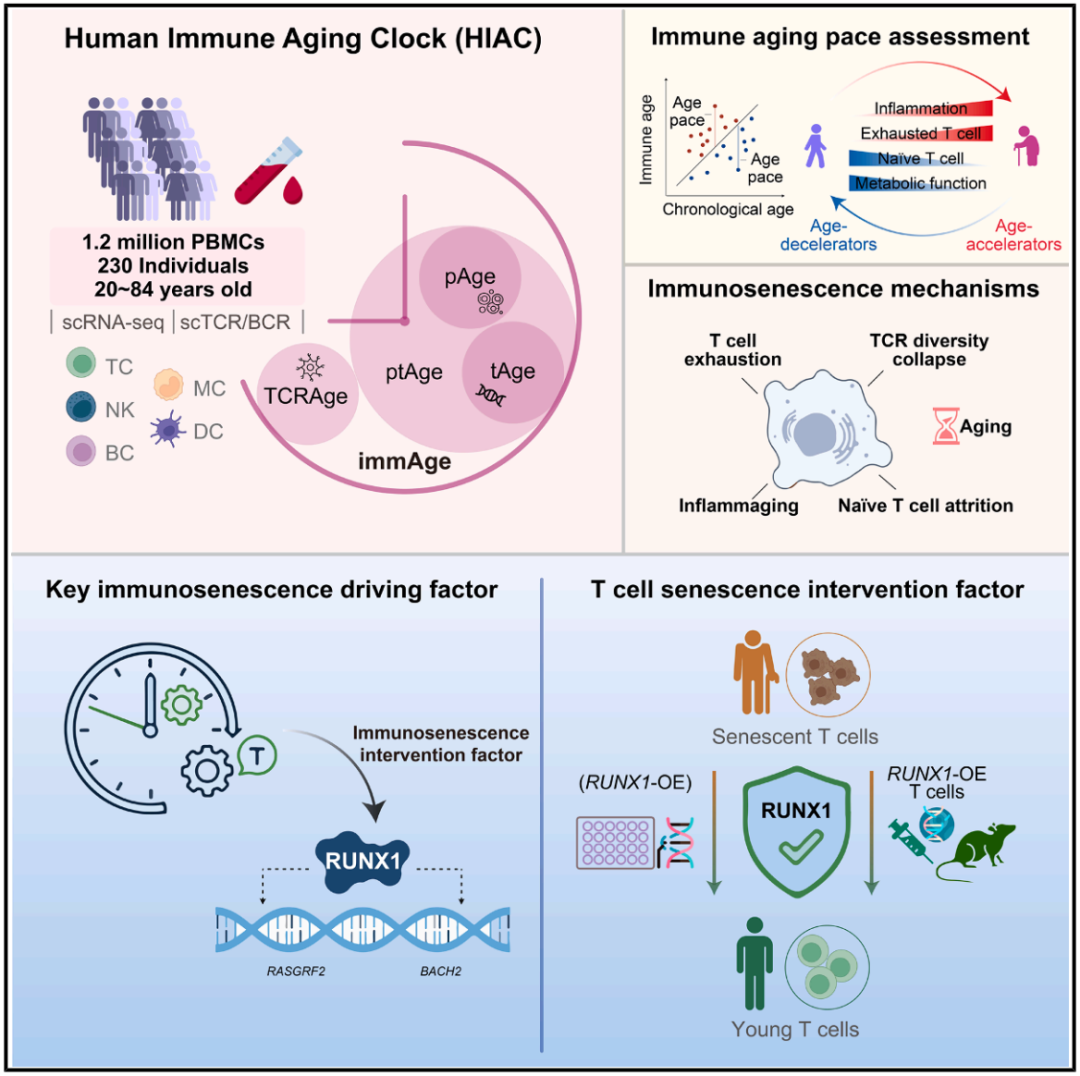 该研究构建了高精度人类免疫衰老时钟(Human immune aging clock,HIAC),系统解析了免疫衰老的多尺度动态变化,发现转录因子 RUNX1 是 T 细胞衰老的功能性“刹车”,并在人免疫细胞及人源化小鼠模型中证明,过表达 RUNX1 可逆转 T 细胞衰老。这项研究形成了从定量评估到因果干预的证据链,将免疫衰老研究推进至可量化、可建模、可靶向的阶段。