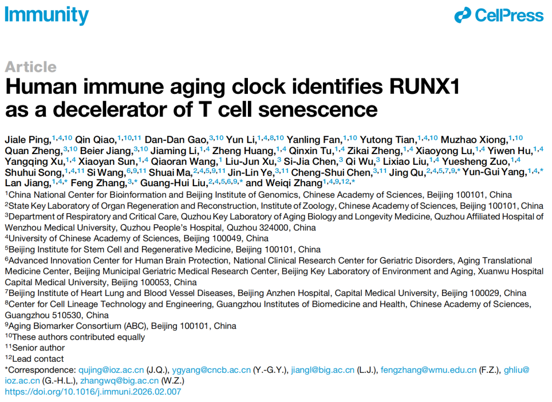 2026 年 4 月 14 日,国家生物信息中心张维绮研究组、中国科学院动物研究所刘光慧研究组、温州医科大学附属衢州医院张峰研究组、国家生物信息中心蒋岚研究组、国家生物信息中心杨运桂研究组与中国科学院动物研究所曲静研究组合作,在 Immunity 期刊发表了题为:Human immune aging clock identifies RUNX1 as a decelerator of T cell senescence 的研究论文。