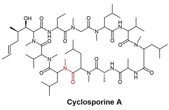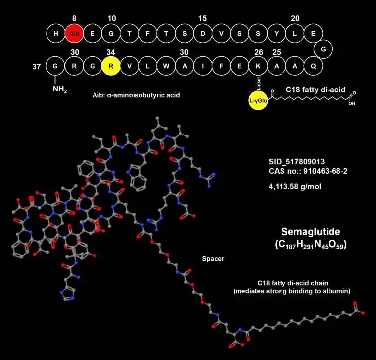 针对上述生理屏障,分子修饰是提升多肽口服可开发性的根本手段。通过对多肽分子结构的精准改造,可以优化其稳定性、渗透性和药代动力学特性。目前主要有三种修饰策略被广泛应用:氨基酸修饰、引入非天然氨基酸、以及脂质或聚乙二醇链。图2 环孢素A的化学结构环化是提升多肽口服适应性的核心技术之一。通过形成环状结构,可以显著改变多肽的物理化学性质:环肽的环化结构减少了自由端,显著降低蛋白酶切割位点,使其对胃酸和蛋白酶具备更高的抵抗力,显著提高了代谢稳定性;同时,环化限制了多肽的构象自由度,使其预先形成适合受体结合的构象,并降低极性表面积,有助于改善膜渗透性。环化策略包括头-尾连接、头-侧链连接、侧链-侧链连接等多种方式。口服环孢素A的成功应用,充分证明了环化策略的可行性。引入非天然氨基酸是增强酶稳定性的经典策略。蛋白酶通常特异性识别L-构型氨基酸,替换为D-构型可显著抵抗酶解。主链氮上的甲基化修饰不仅能阻断氢键供体、降低极性表面积,还能显著提高多肽的膜渗透性,并抑制蛋白酶的水解作用。这一策略在环状肽的设计中尤为关键,常被称为“N-甲基化扫描”以寻找最佳渗透性位点。聚乙二醇化是将聚乙二醇链共价连接到多肽分子上的策略,通过增加多肽的流体动力学体积,显著降低肾脏清除率,从而延长体内半衰期。聚乙二醇链在多肽表面形成的“保护伞”结构,能够屏蔽蛋白酶的攻击位点,抑制酶介导的降解。然而,聚乙二醇化也可能导致多肽的生物活性下降,且分子量的显著增加可能进一步阻碍跨膜转运,因此需在半衰期延长与渗透性之间寻找平衡。脂质化修饰通过脂肪酸链修饰增加白蛋白结合率,进一步延长半衰期并改善渗透性。司美格鲁肽的成功应用充分证明了这一策略的潜力。前药策略则是在多肽分子上连接特定基团,使其在胃肠道环境中暂时“失活”或“隐身”,以抵抗酶解或提高渗透性,待吸收进入体循环后,在体内特定环境下释放原药。图3 司美格鲁肽化学结构3.制剂技术与给药系统的创新突破