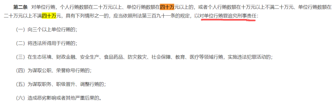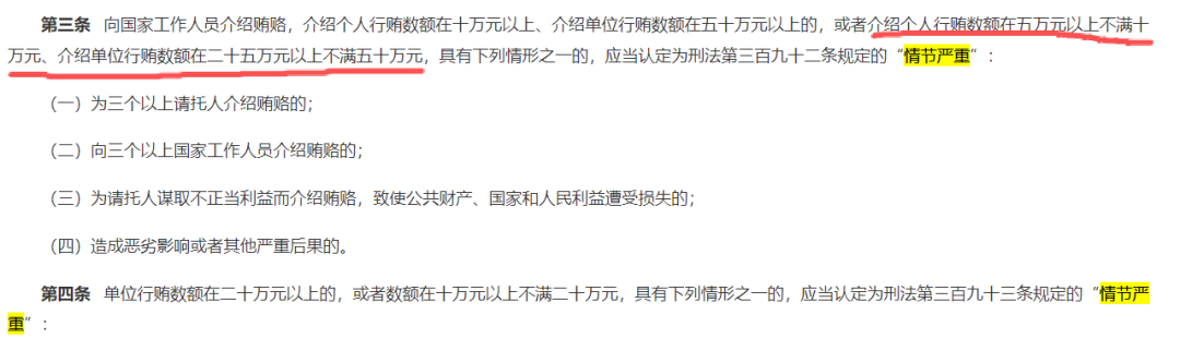 《解释(二)》明确:介绍个人行贿10万以上、单位行贿50万以上的,就构成"情节严重",追究刑事责任。