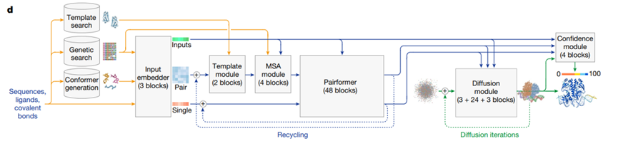 a)扩展到了多种生物分子的复合物结构预测,包括蛋白质-DNA、蛋白质-RNA、蛋白质-小分子,并使用扩散模型。