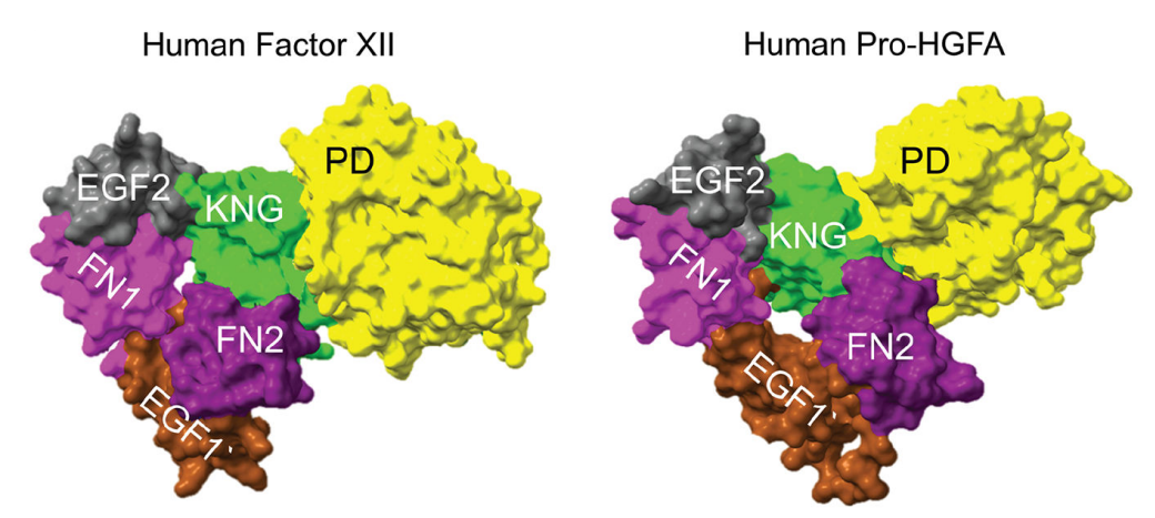 F12是一种分泌蛋白,主要在肝脏中生成,并以单链酶原的形式存在于血浆中。当与带负电荷的表面接触时,FXII会转化为具有双链结构的活性形式,FXIIa。FXIIa重链由6个结构域组成,纤维连接蛋白II型结构域、表皮生长因子(EGF)样结构域、纤维连接蛋白I型结构域、第二个EGF样结构域、kringle结构域和富含脯氨酸的区域。FXIIa轻链含有His393-Asp442-Ser544催化三联体。FXIIa的重链和轻链通过二硫键相互连接。FXIIa的重链含有假定的细胞和表面结合位点,以及Zn2+,FXI,肝素和纤维蛋白结合区域。