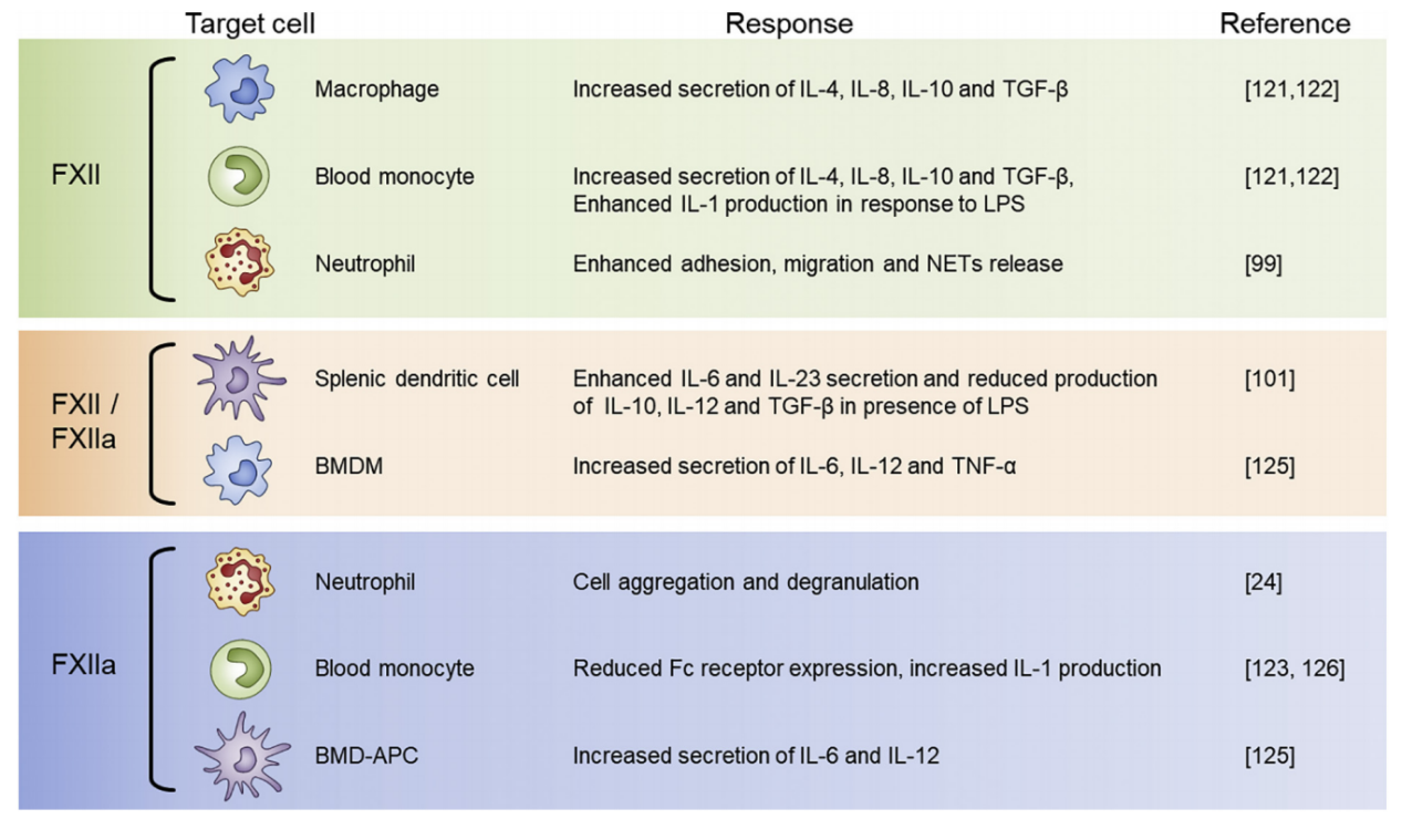 FXII能够与中性粒细胞、血液单核细胞、骨髓来源的巨噬细胞以及树突状细胞相互作用。FXII能够使血单核细胞/巨噬细胞通过诱导分泌IL-4、IL-8、IL-10和转化生长因子(TGF)-β等物质,转变为M2型表型,并且被发现能够促使人类肺部表达IL-8、IL-1β、IL-6、白血病抑制因子、CXCL5和TNF-α等物质。