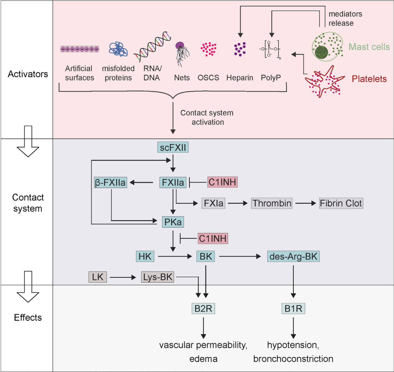FXII驱动的接触系统是由一系列蛋白酶和抑制剂组成的网络,它整合了四个主要途径:补体系统,凝血级联反应,纤维蛋白溶解系统,以及激肽释放酶-激肽系统。这个系统被称为“血浆接触系统”,是因为当FXII与阴离子表面“接触”时会被激活,从而导致构象改变,形成具有活性的FXIIa。
