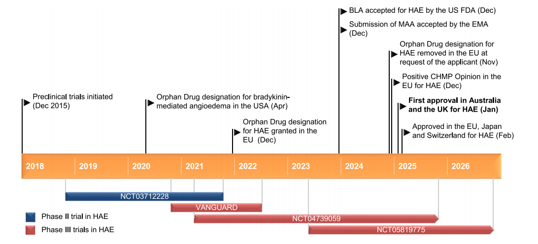 Garadacimab是一种全人源IgG4/λ重组单克隆抗激活型凝血因子XII抗体,用于预防遗传性血管性水肿发作。Garadacimab能够与FXIIa(以及βFXIIa)的催化域结合并抑制其活性。抑制FXIIa可以通过阻断激肽释放酶-酸性凝血酶级联反应来预防遗传性血管性水肿发作,该级联反应包括激活前激肽释放酶为激肽释放酶以及产生缓激肽,而缓激肽会导致遗传性血管性水肿发作时的肿胀和炎症。