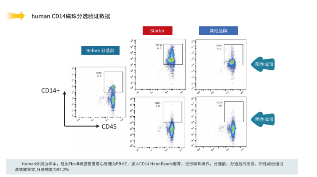 本流程以磁珠分选阳性选择法为核心,完成人源 CD14 + 单核细胞的分选,并开展后续树突状细胞(DC)的诱导分化,为后续人源树突状细胞功能验证及 T 细胞激活功能检测实验提供实验基础与操作依据。