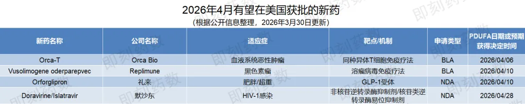 4月4款创新药有望获FDA批准