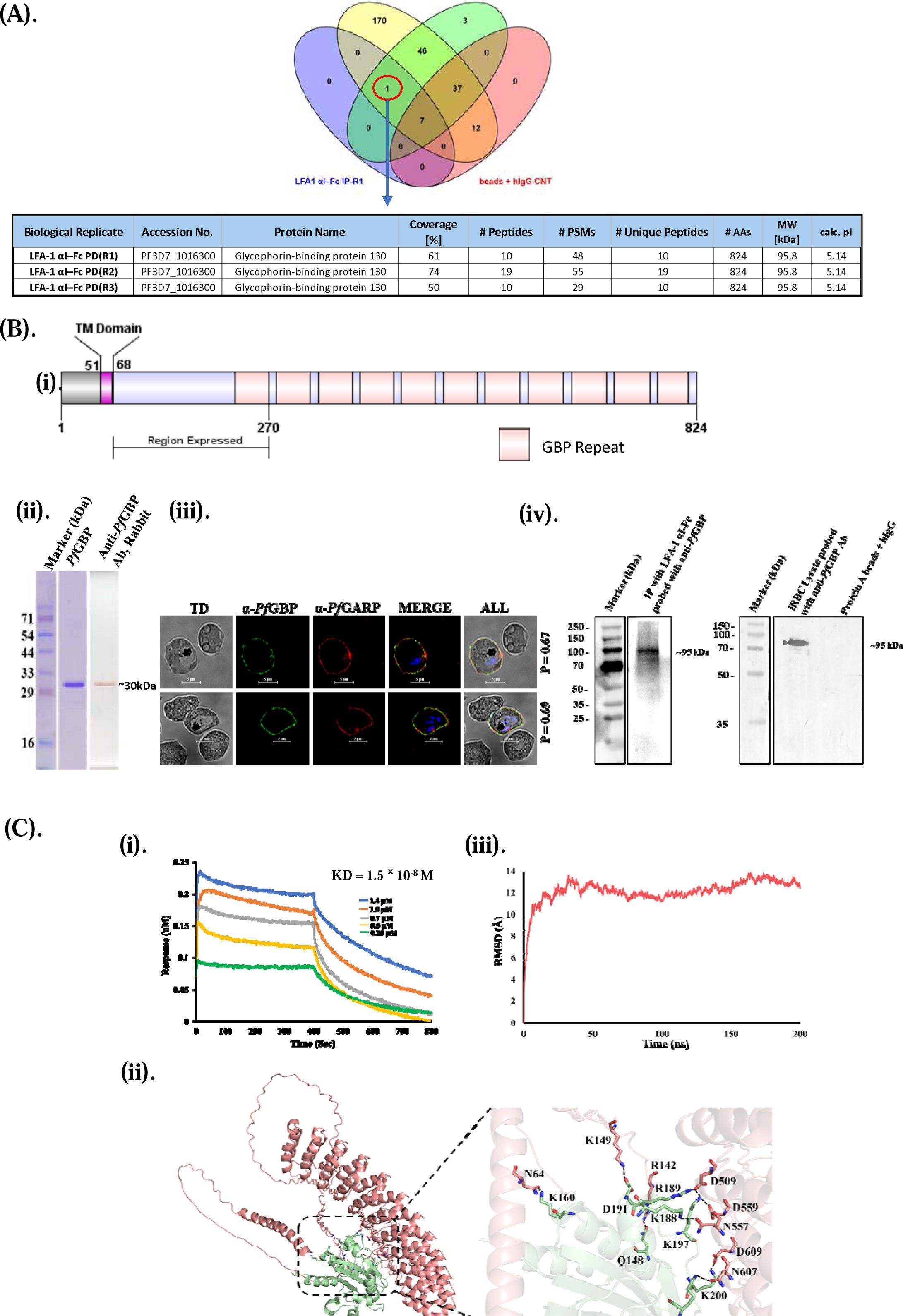 GBP-130) as a surface-expressed ligand on iRBCs that binds the I-domain of LFA-1 (LFA-1 αI). Using an LFA-1 αI-Fc fusion protein, we demonstrate stage-specific binding to iRBCs, and LC-MS/MS analysis of immunopreciptates of αI-Fc bound to iRBC revealed