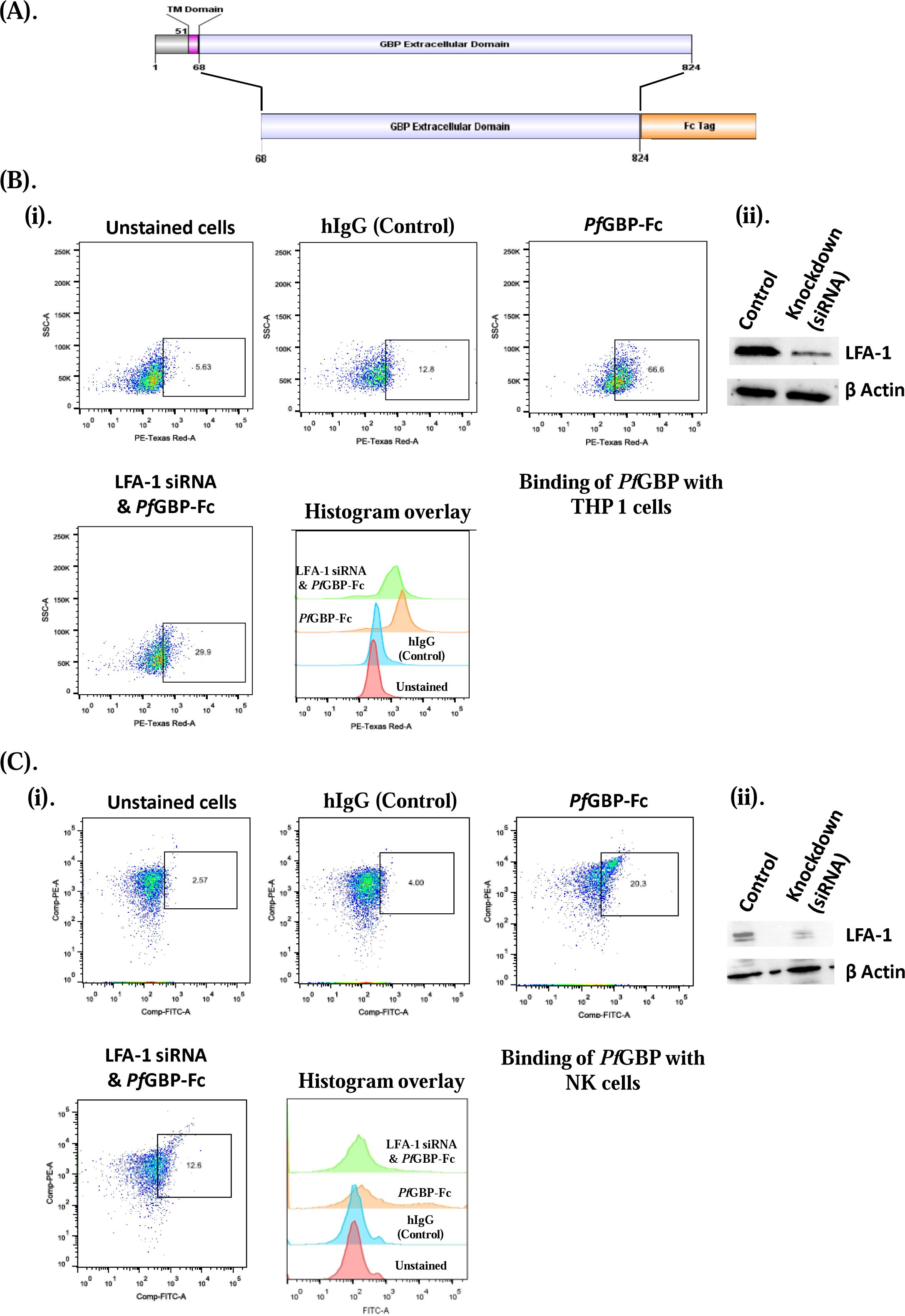 –infected red blood cells. Flow cytometry analysis using PE-Texas Red–conjugated anti-human IgG antibody demonstrated specific binding of the LFA-1 αI-Fc protein to ring, trophozoite, and schizont stages of iRBCs, indicating interaction across all major asexual blood stages.