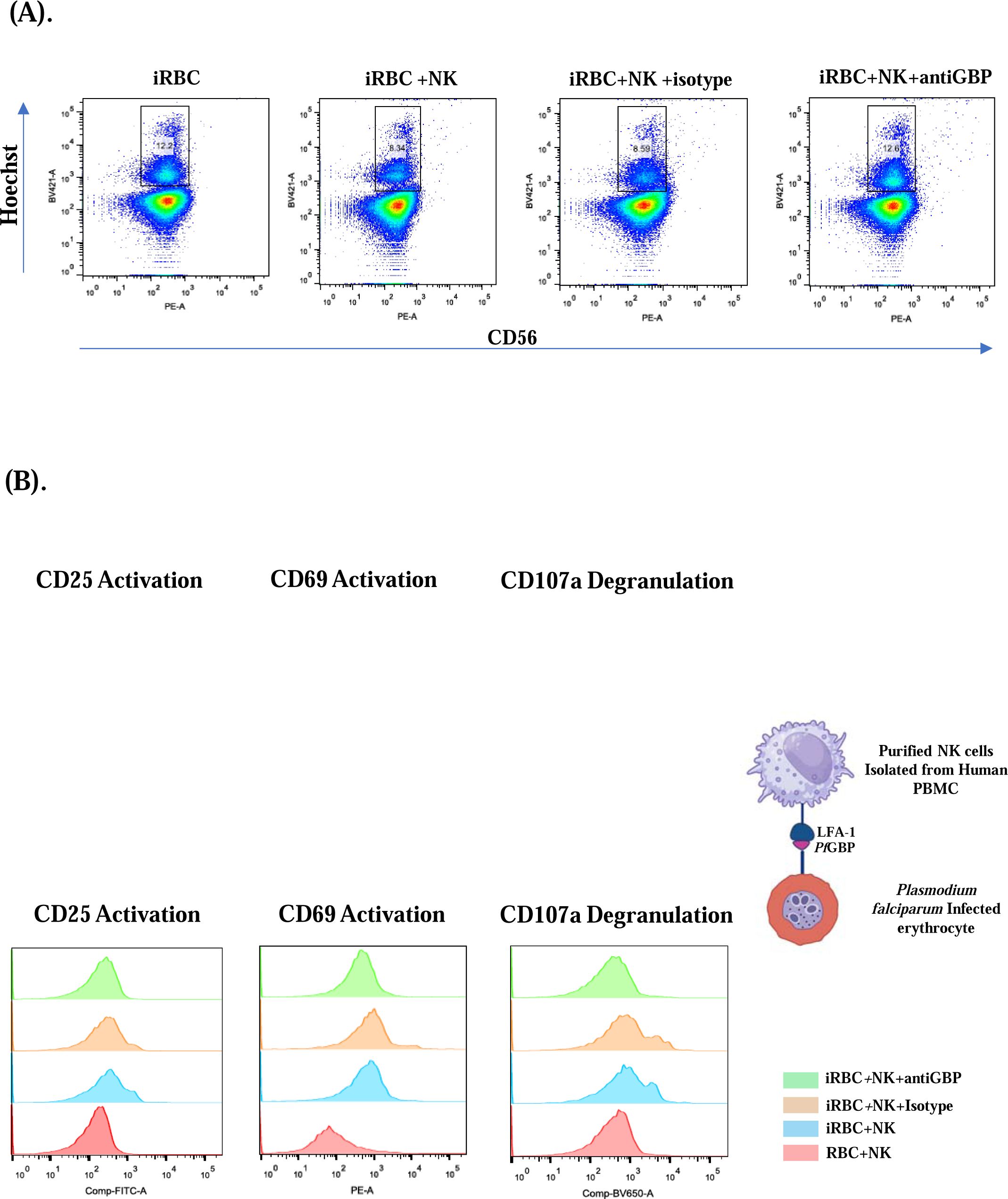 Infected RBCs (iRBCs) activates NK cell, enhancing IFN-γ production and cytotoxicity through perforin and granzyme release. This activation is contact-dependent, as demonstrated by the lack of upregulation of NK cell activation markers during transwell incubation. Co-incubation of iRBCs with NK cells promote