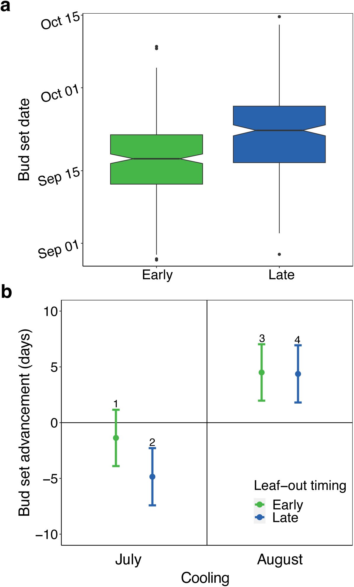 ) saplings to test (i) how spring leaf-out timing and June-August temperatures influence end-of-season timing (bud set and leaf senescence [50% loss of leaf chlorophyll content]), and (ii) whether daytime and nighttime temperatures before and after the solstice have different effects, given that trees primarily grow at night. Bud set and leaf senescence responses were tightly coupled (