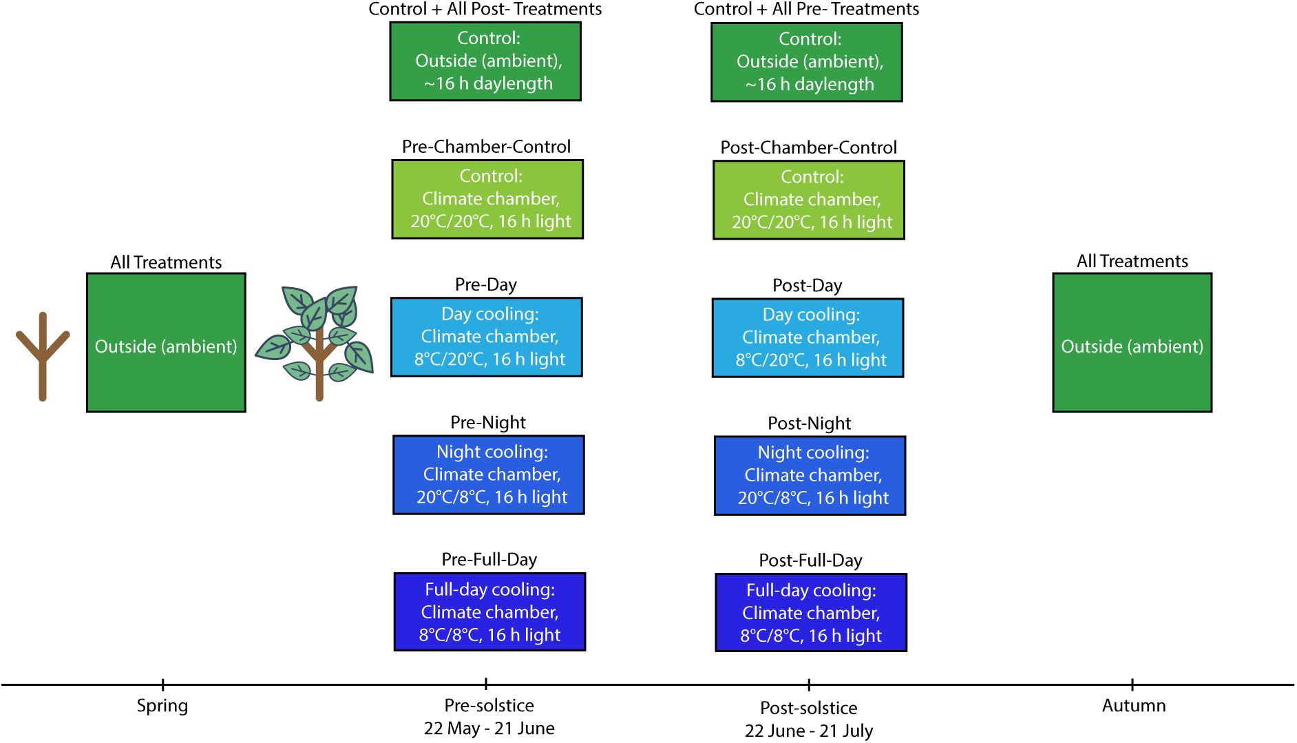 ). We ask three main questions: i) How does cooling before vs. after the solstice affect EOS timing? ii) How do diel (daytime vs. nighttime) temperature changes differ in their effects? iii) Does the timing of leaf-out modulate the reversal of temperature effects on autumn phenology? Diel temperature variations are relevant because trees typically grow more at night when temperatures and water deficit are lower (