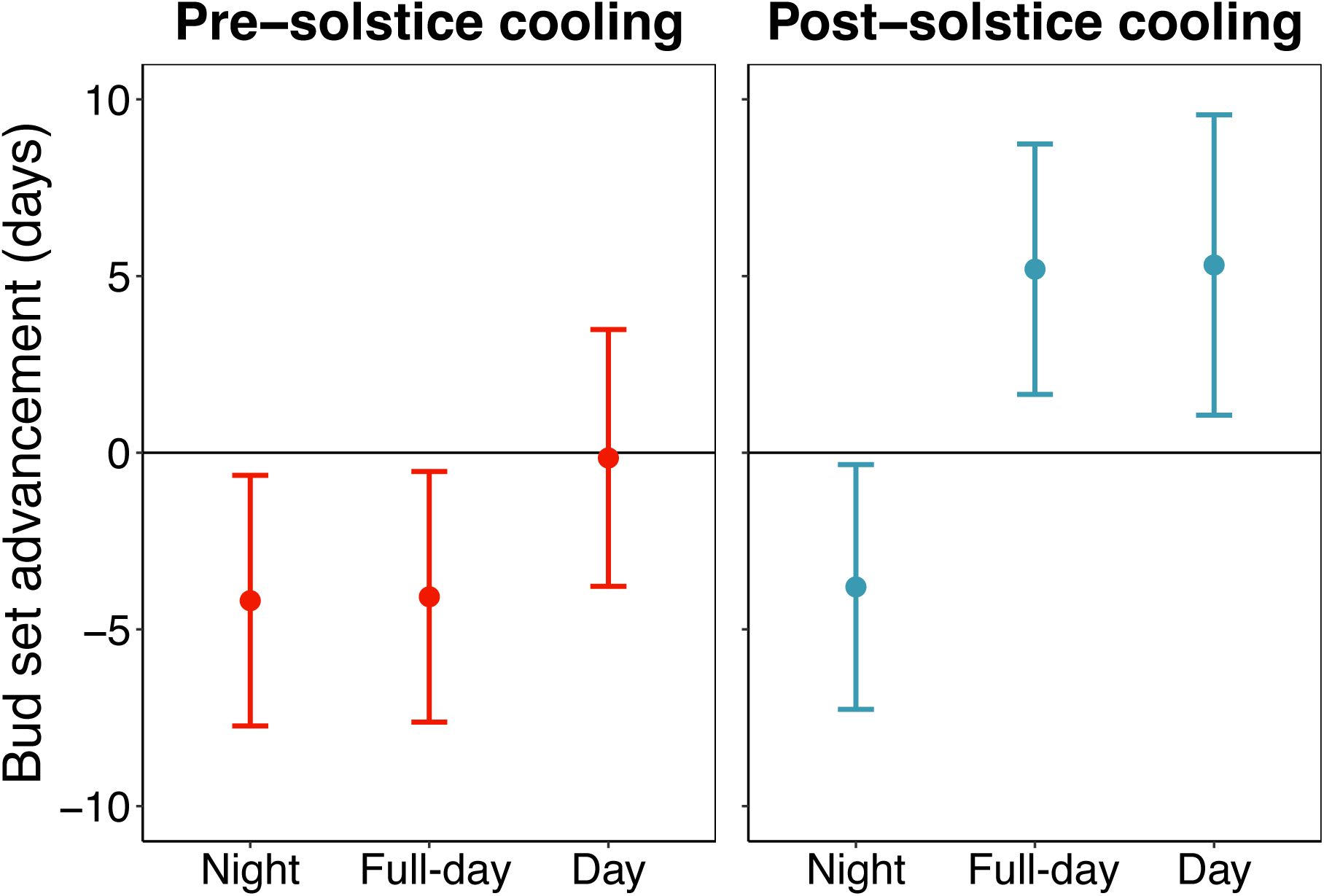 ). The opposite is equally true in colder years, with pre-solstice cooling delaying autumn phenology and post-solstice cooling advancing it. This reversal in temperature effects provides an explanation for the less pronounced shifts in autumn phenology compared to spring (