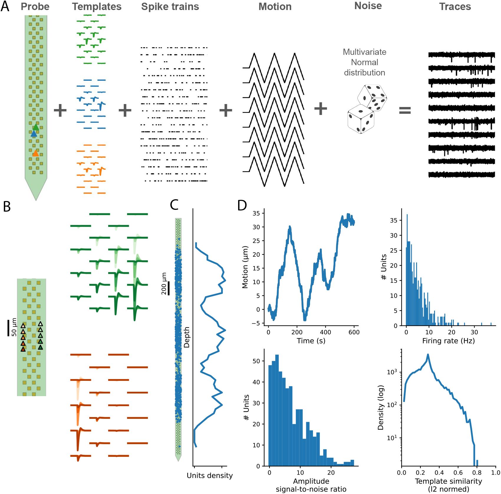 Almost all spike sorting algorithms follow a similar data processing pipeline which we break down into five components: preprocessing, peak detection, feature extraction, clustering and template matching. In more detail: raw signals are preprocessed (sometimes with correction for probe motion), then a selection of putative spikes are detected. Features from these spikes are computed and used to form clusters. Templates, representing the spatial-temporal footprint of the “average” spike in the cluster, are then computed to detect spikes using a deconvolution method. Different spike sorters use different methods for each sorter component (see