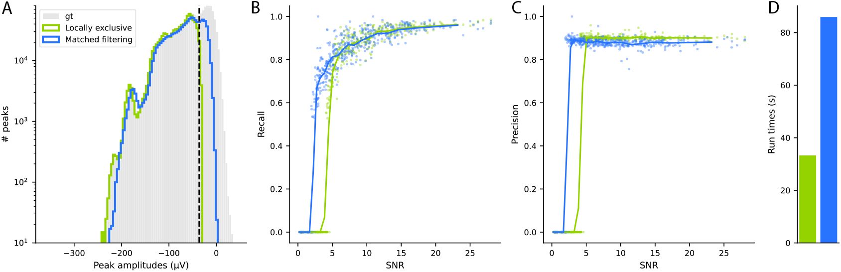 ], direct benchmarks of individual spike sorting steps are still limited and scattered in the field. Every new contribution, such as a new peak detection or clustering method, requires a large overhead effort to compare it to other methods, i.e., ad-hoc and non-validated re-implementations, or the development of sub-optimal integrated pipelines to compare with other existing tools. It is also currently very difficult to ask questions of the type “how does a new peak detection method affect the downstream results of a given spike sorter?”.