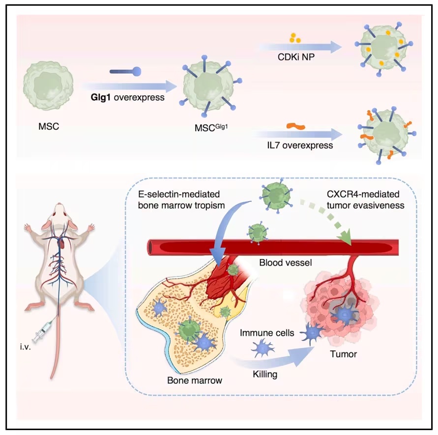 在这里,研究人员开发了一种BM靶向和肿瘤规避细胞载体,它将免疫调节限制在BM小生境,通过小生境衍生的信号转导实现全身免疫重编程。这种基于间充质干细胞(MSC)的载体过表达高尔基体蛋白1 (MSCGlg1)来模拟BM亲和信号。