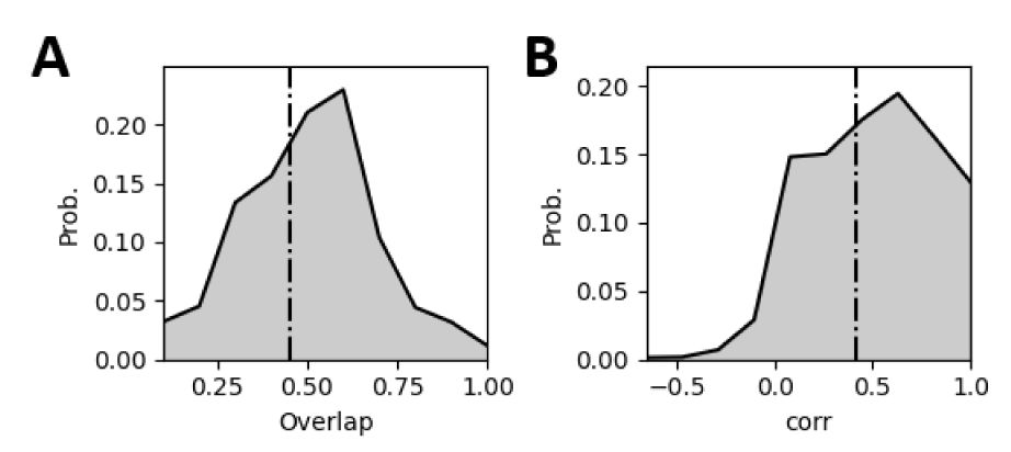 The probability distribution of correlation of mean firing rate of neurons within-session (orange curve) and cross-session (olive curve). (