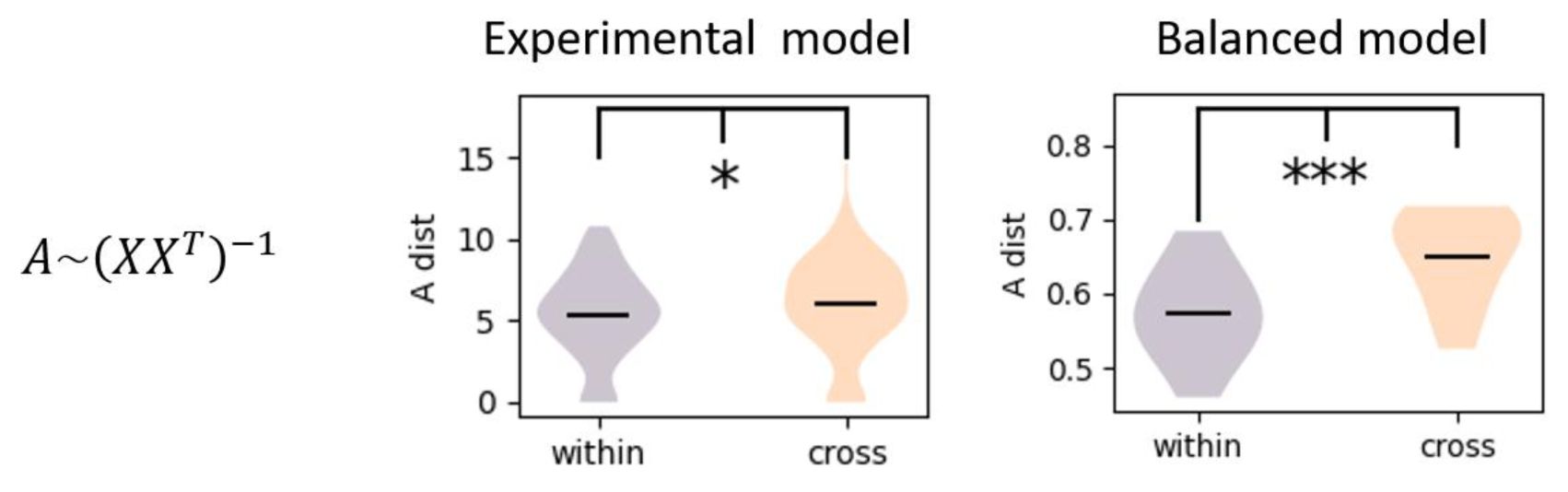 ) The distance between the functional connectivity, i.e., correlation between the neuronal activity, within-session and cross-session (t- test,
