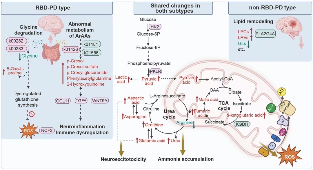 分析表明,帕金森病患者表现出显著的代谢重编程,其特征为能量代谢从三羧酸循环向糖酵解的转变、尿素循环失调、脂质重塑以及广泛的炎症和免疫反应的激活,这些反应涉及 PI3K-Akt、IL-17、NF-kappaB、MAPK 和 TNF 信号通路。值得注意的是,RBD-PD 亚组表现出独特的代谢紊乱,其特征是肠道微生物群衍生的有毒芳香族氨基酸分解代谢产物的积累。重要的是,这些变化在特发性 RBD(iRBD)患者中也有所体现,这代表了帕金森病的前期阶段。