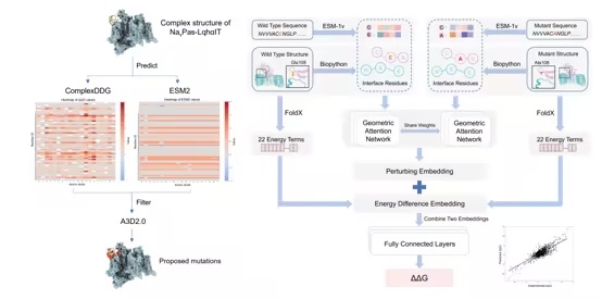 分子之心自研ComplexDDG等AI蛋白质算法,成为突破这一行业普遍性瓶颈的关键钥匙。基于美洲大蠊钠通道NavPaS-蝎毒素LqhαIT复合物结构,该算法仅用数小时便设计出101个高潜力的候选分子。经AI算法的多维度智能评估,最终确定28个分子进入湿实验验证环节,并成功锁定一个杀虫效力翻倍,同时保留对哺乳动物低毒性的高效力候选分子。这一案例充分展现了AI蛋技术在复杂蛋白质精准设计上的强大能力。