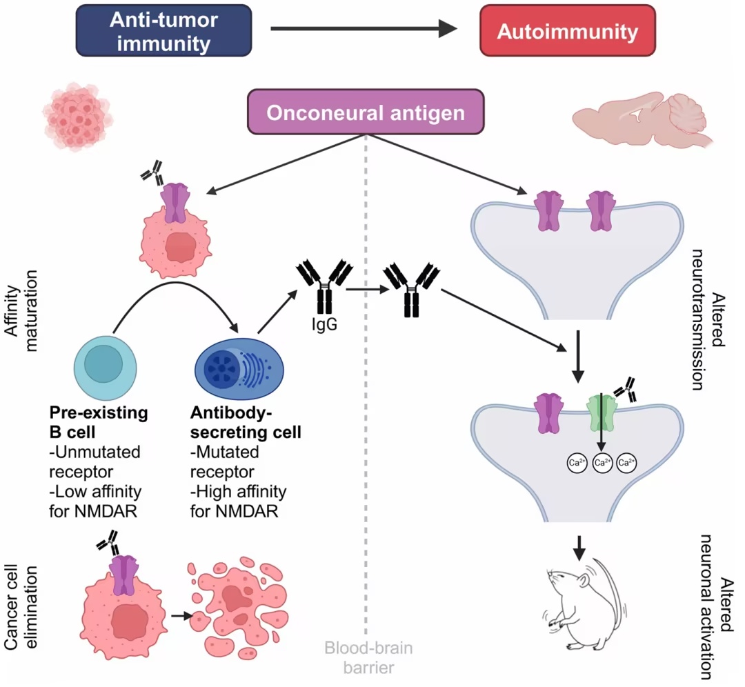 综合来看,该研究的数据确立了肿瘤内 NMDAR 表达、抗体成熟与自身免疫发病之间的直接联系。这些发现表明,基因编码的抗 NMDAR 抗体有助于免疫监视,但在成熟后也可能触发自身免疫疾病,揭示了癌症免疫与神经毒性之间的机制性权衡。