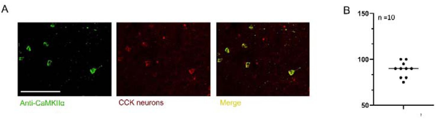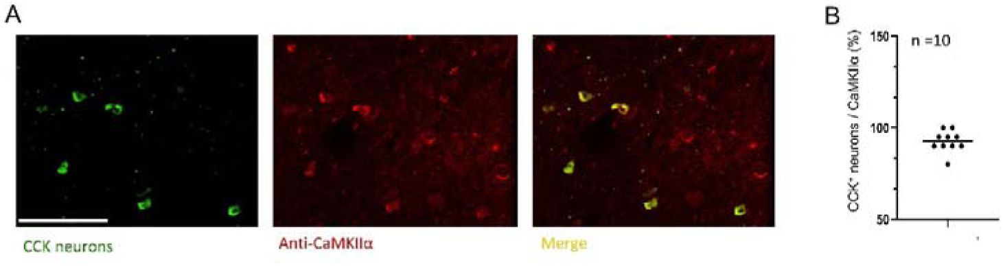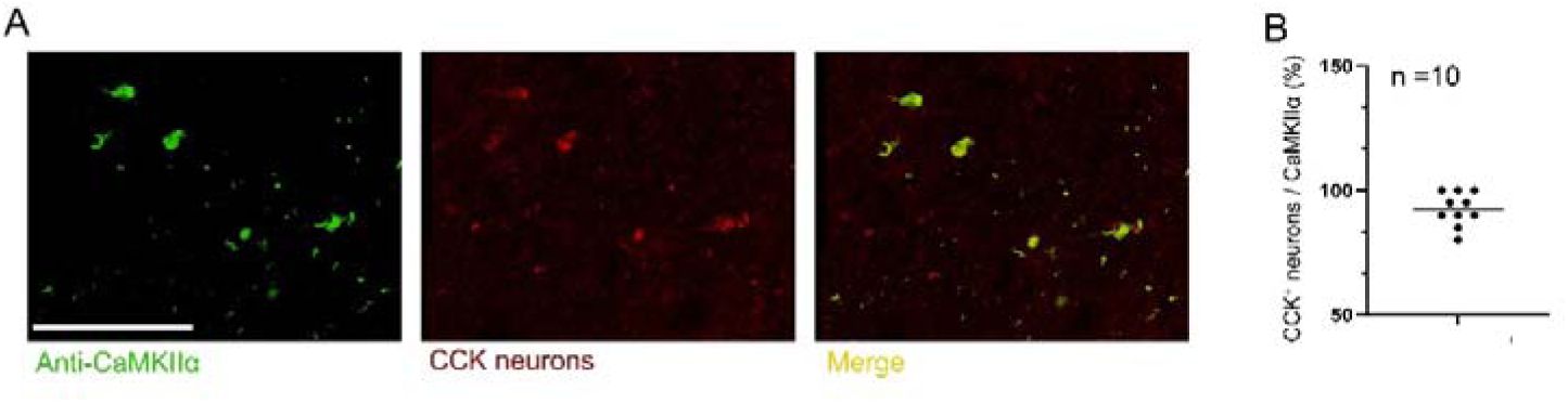 Representative image of co-immunofluorescent labeling of CCK-positive neurons with the excitatory neuronal marker CaMKIIα in the CA3 region. Scale bar, 100 µm.