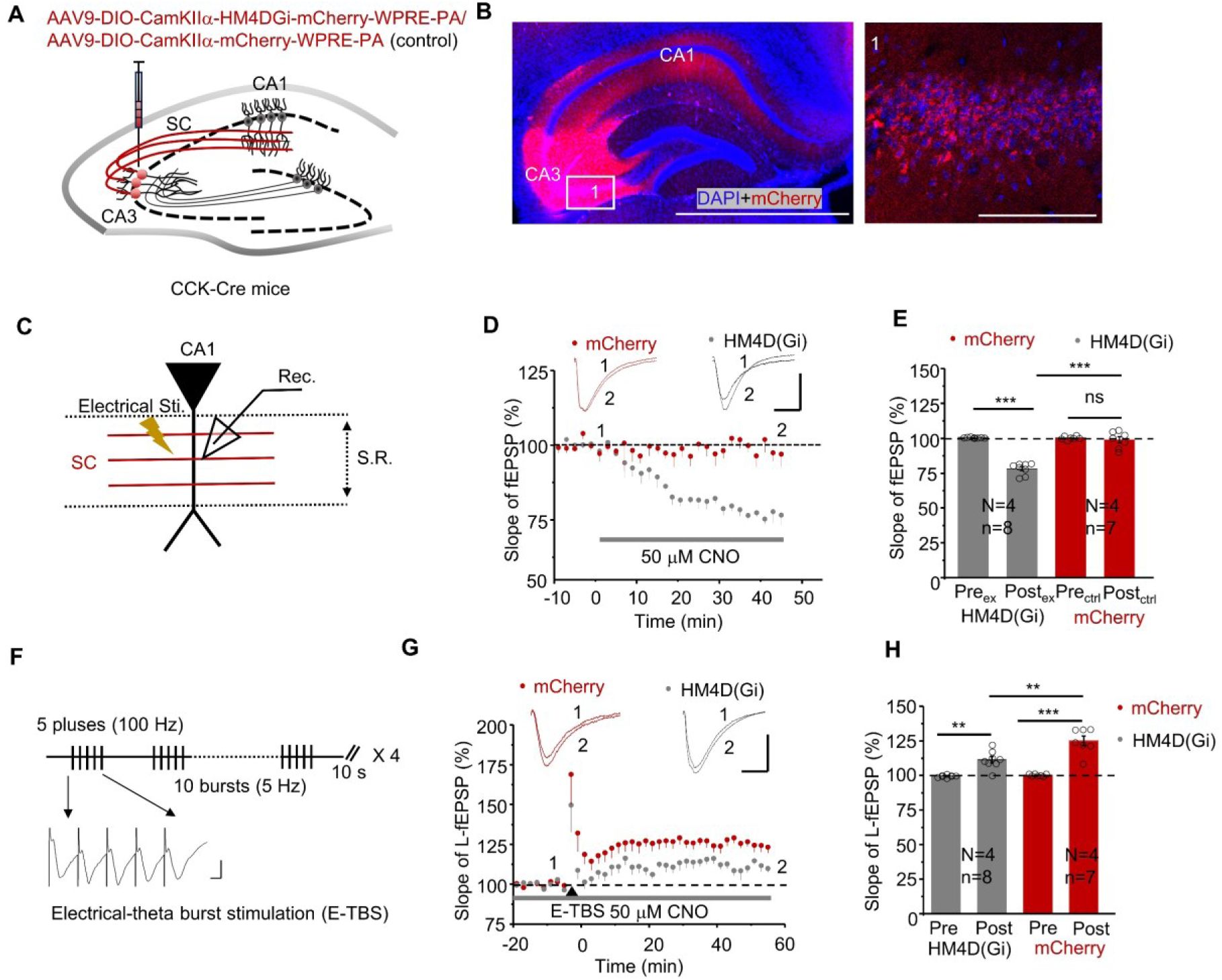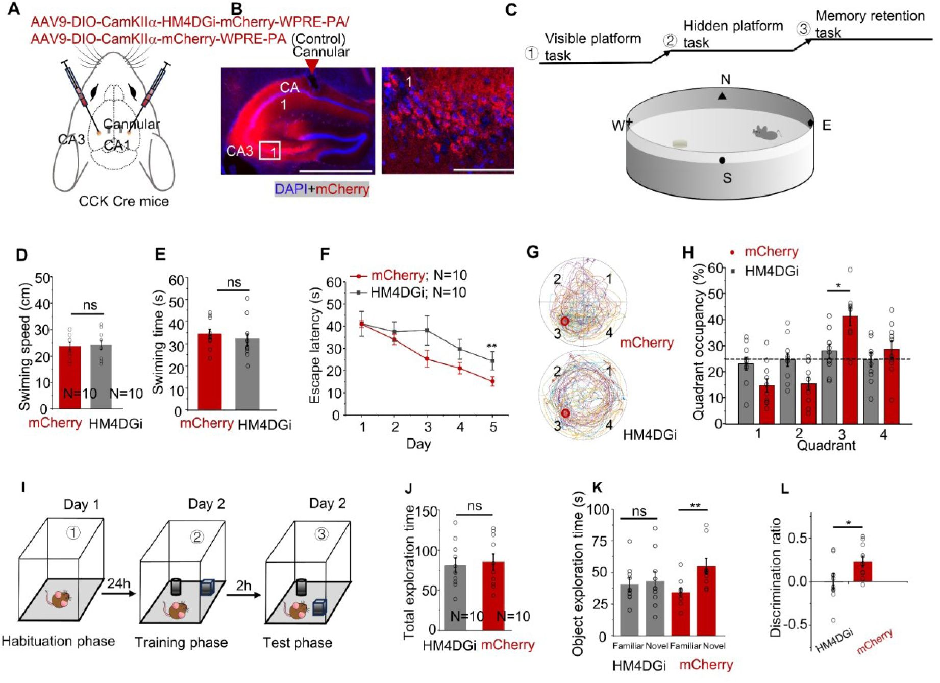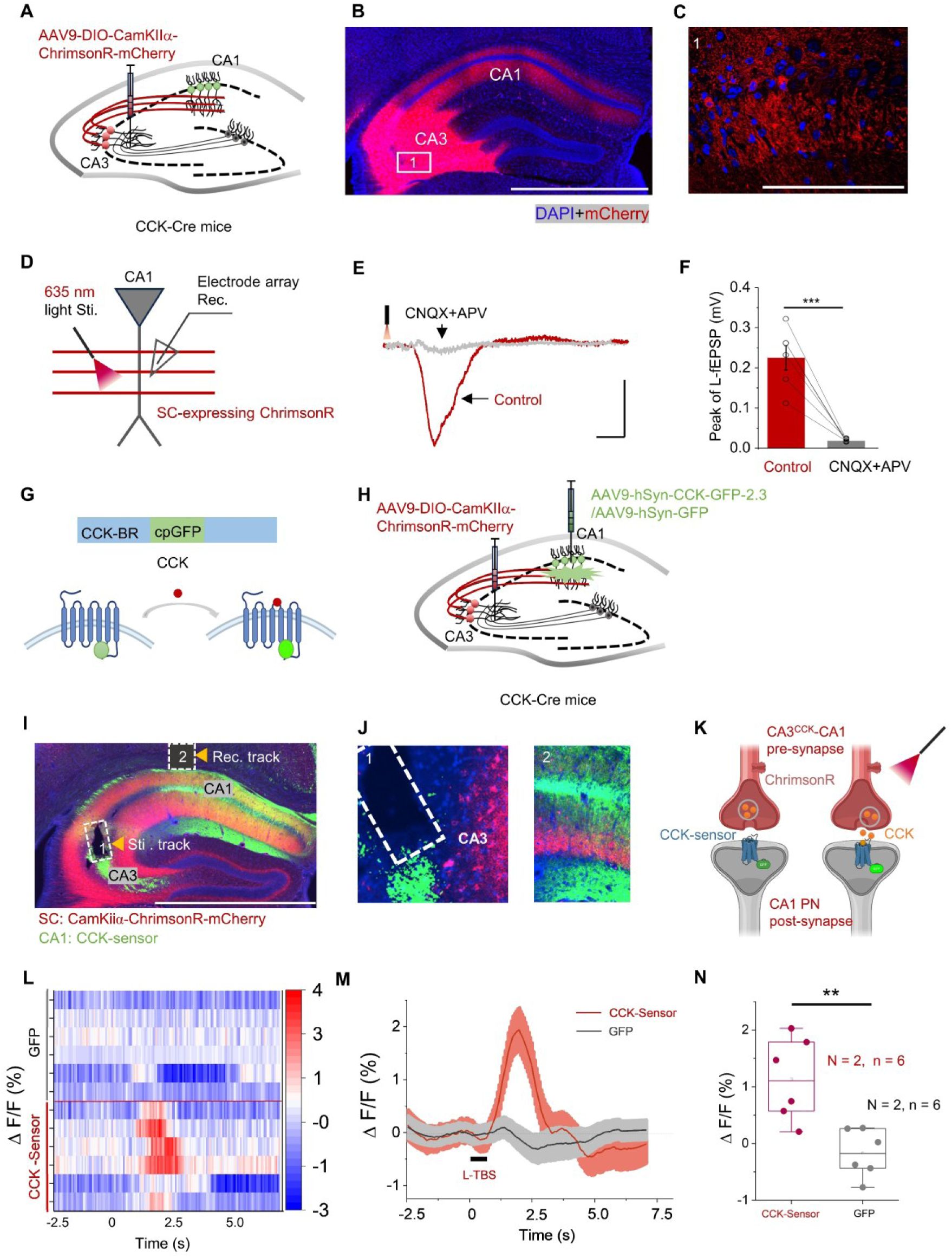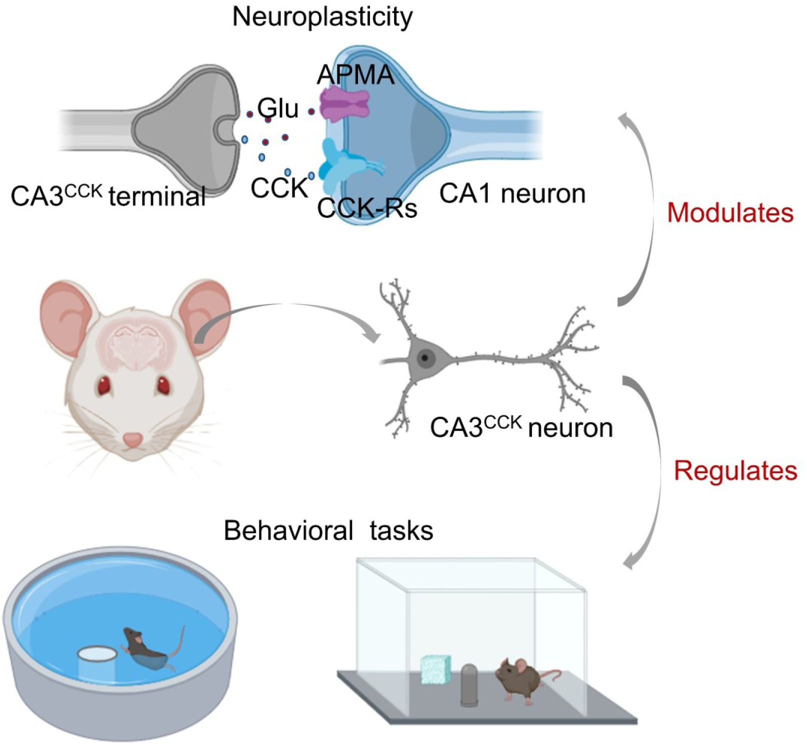 ). However, the exact mechanism by which CCK regulates the hippocampus plasticity and hippocampus-dependent behaviors has not yet been fully elucidated. To address this knowledge gap, we adopted the transgenic mice, optogenetics, GPCR-based sensor, extracellular recording, chemogenetics, RNA interference technique, calcium recording and behavioral task to investigate: 1) the distribution profile of CCK-positive neurons in the CA3 area of dorsal hippocampus (DHP), 2) activation of CA3