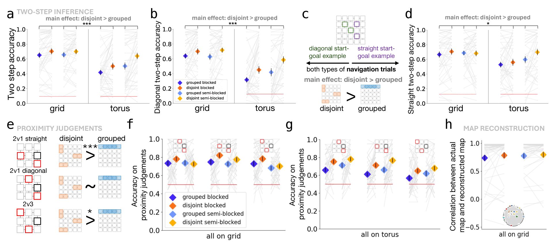 ). More fine-grained examination of the behavioural data hinted that relatively impaired inference following grouped training may have occurred because grouped training encouraged participants to learn rows and columns as a series of unconnected ‘fragments’, and thus to learn a partially fragmented version of the cognitive map.