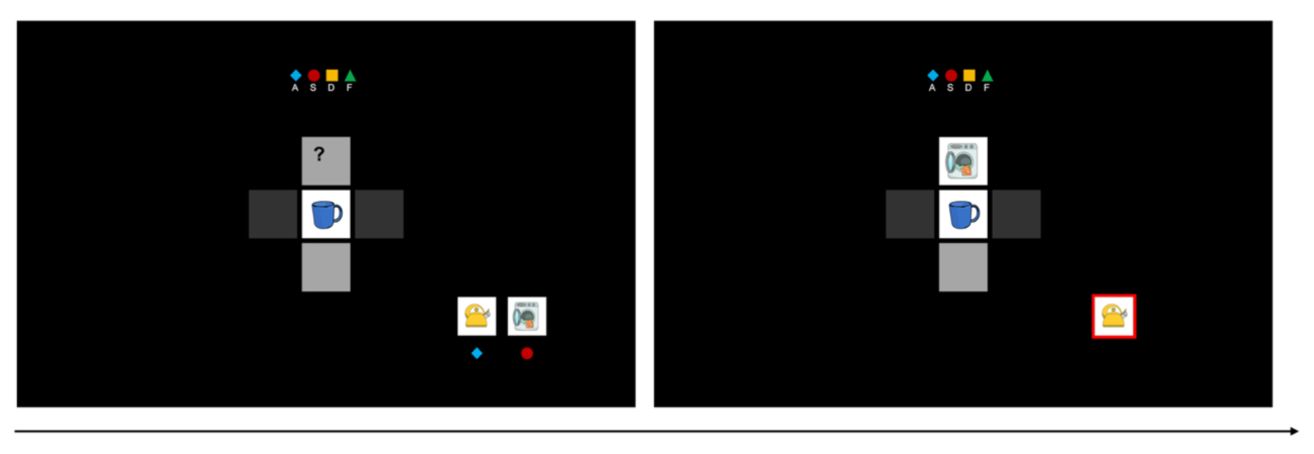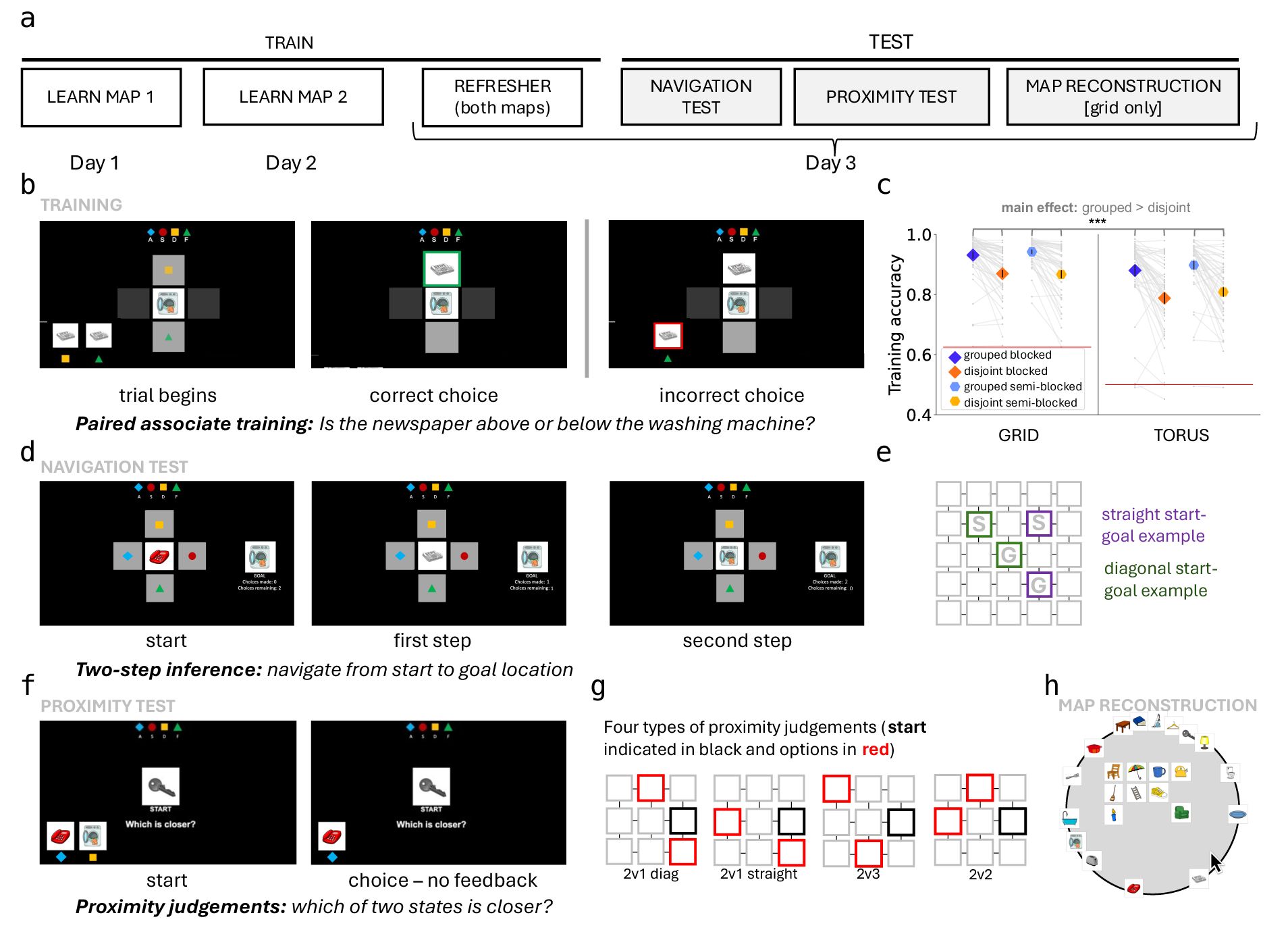 ). Participants never viewed these full maps at once (e.g. they were never shown a bird’s eye view). To test the effect of learning curriculum on participants’ ability to perform multi-step inference, over three days we trained participants on an exhaustive set of one-step associations between states before then testing their ability to complete two-step inference. During training, they navigated from one state (e.g. a washing machine) to one of its neighbours (e.g. a newspaper) by selecting whether the newspaper was up, down, left or right of the washing machine and receiving feedback as to whether their choice was correct or not (