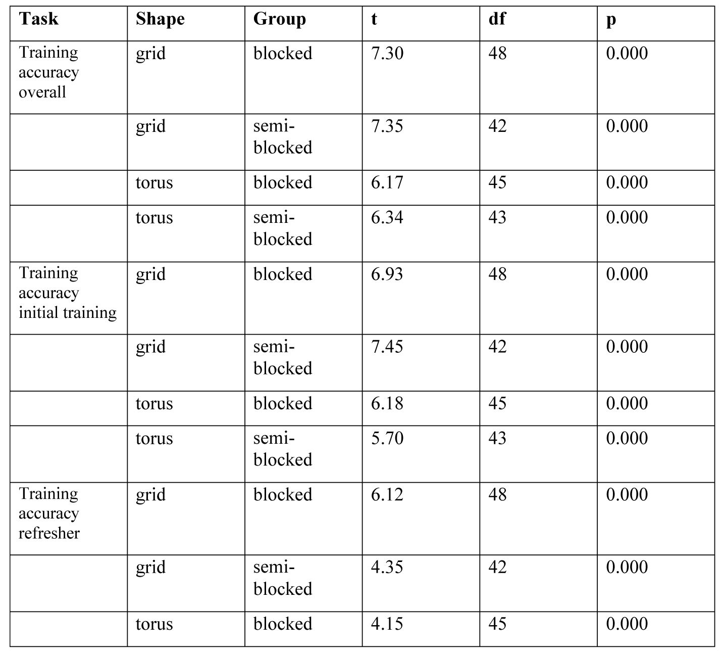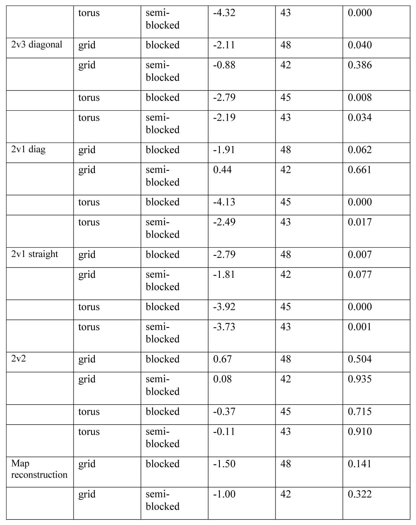 In total, we conducted 4 experiments (two groups per map shape; one blocked and one semiblocked) involving a total of 182 participants, of whom 92 learned grid maps (49 blocked, 44 semi-blocked) and 90 learned torus maps (46 blocked, 44 semi-blocked). Each cohort started with 50 participants and final group numbers depended on the participant attrition rate across the three days of the experiment.