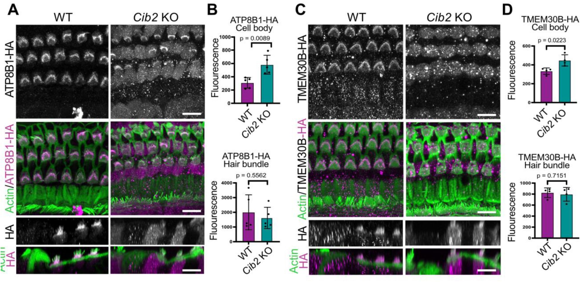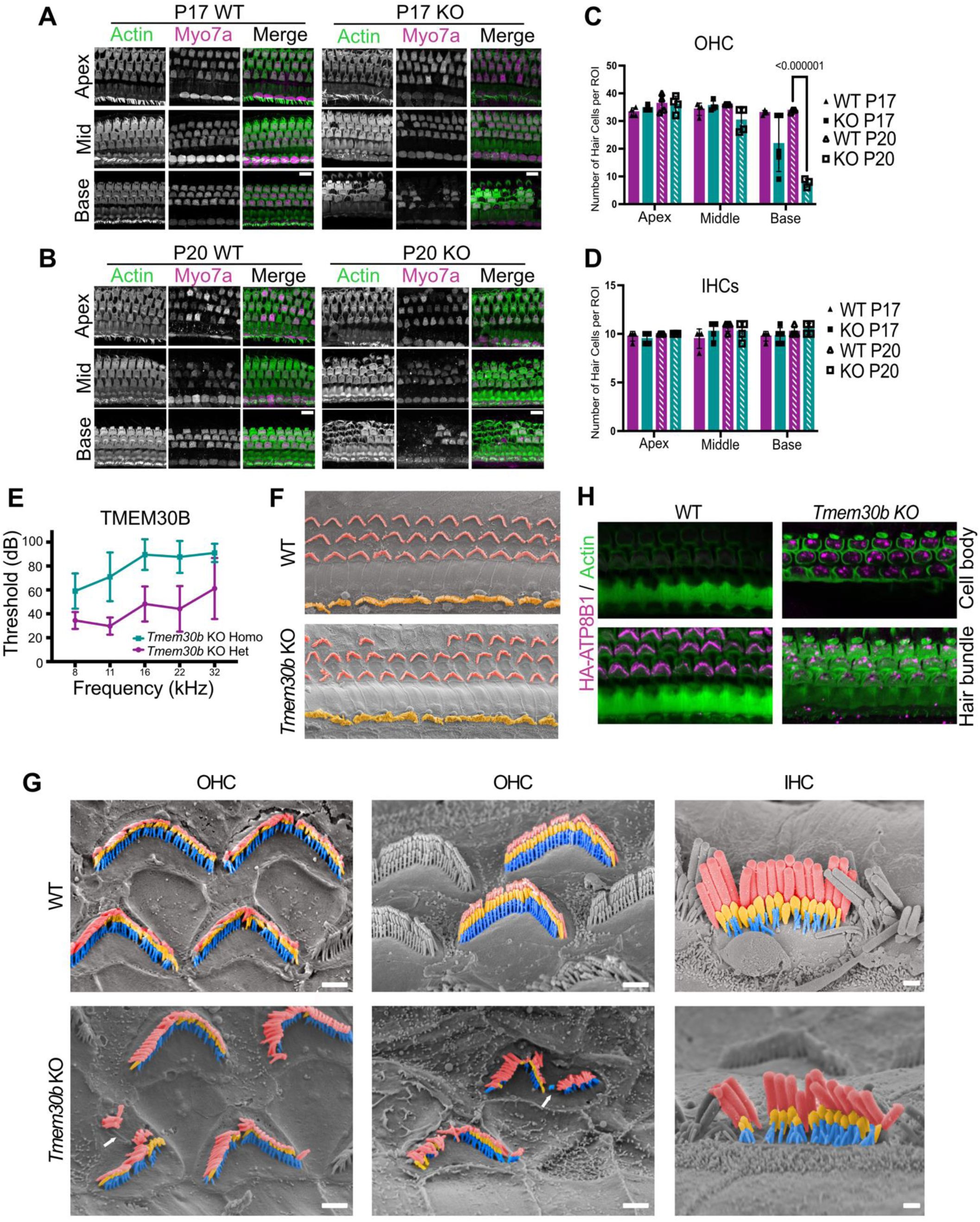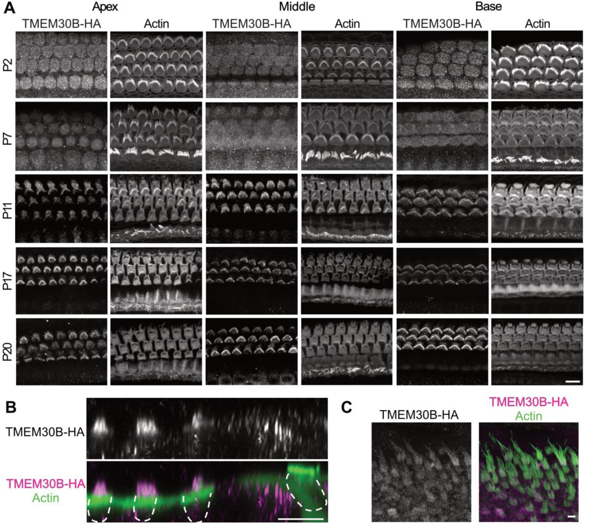 ). However, the cellular and molecular basis of the mechanism underlying the hearing loss, and the developmental regulation and subcellular localization of TMEM30B in hair cells remained unknown.