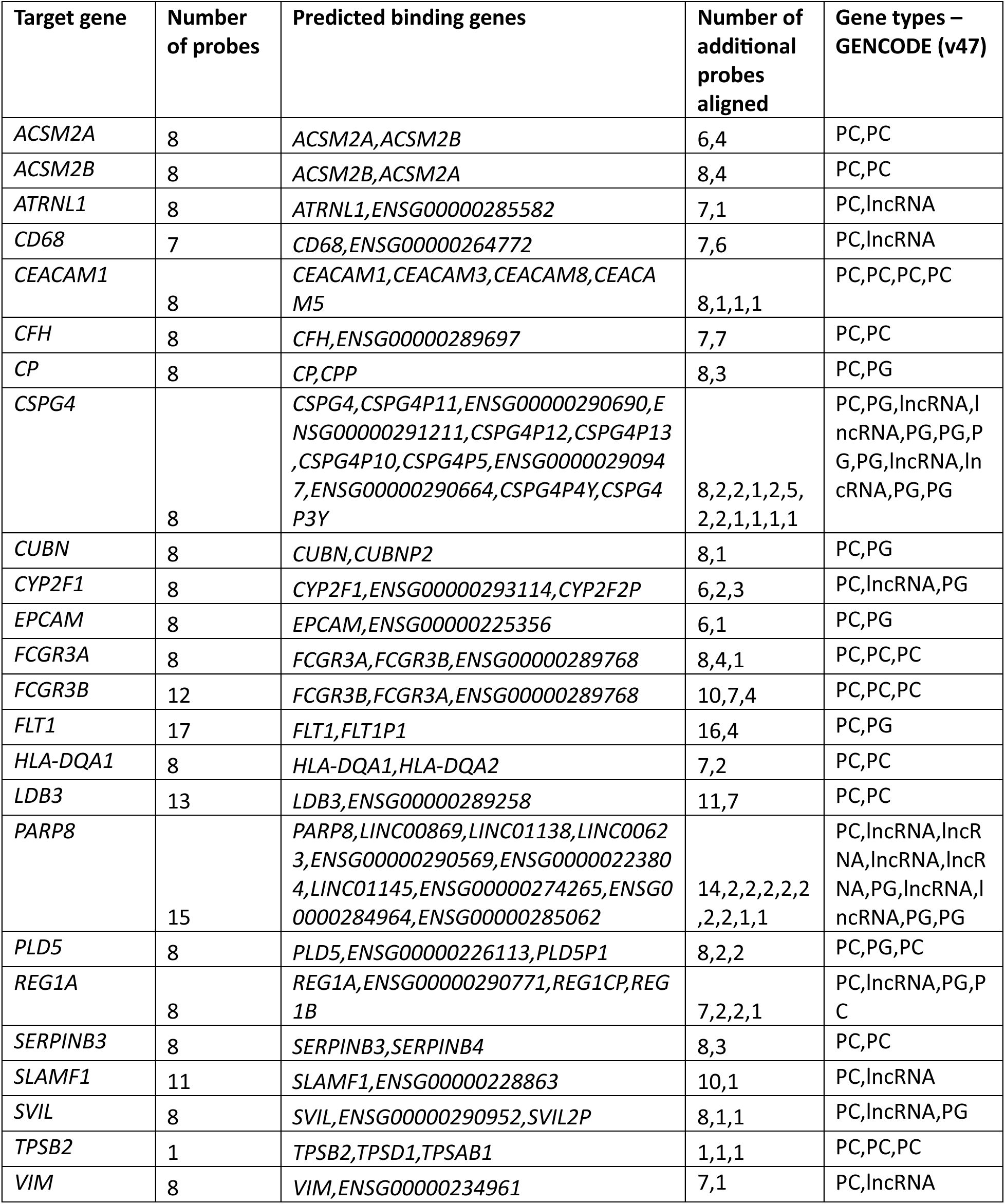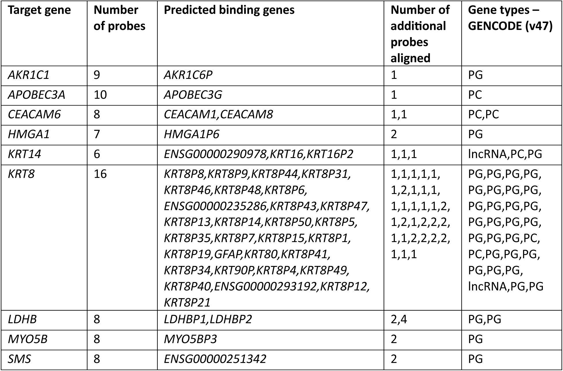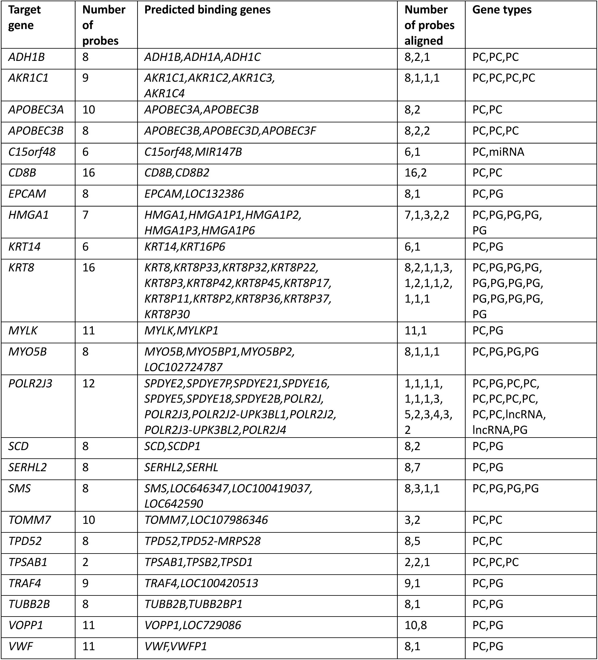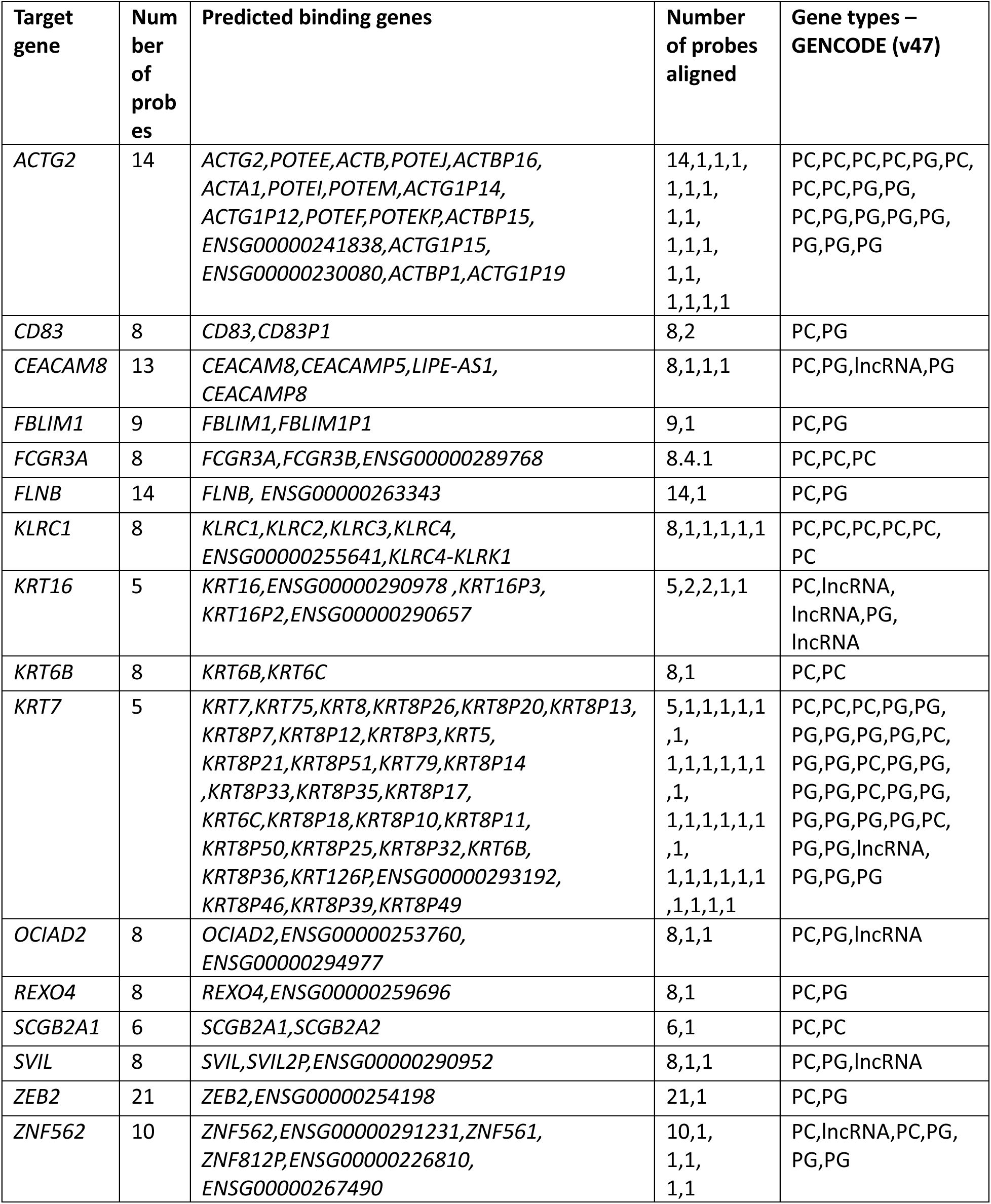 ). Among the 37 genes with predicted off-target binding, the number of affected probe sequences per gene ranged from 1 to 8. Overall, these off-target probes matched 71 other genes, including 20 protein-coding genes, 31 pseudogenes, 10 long non-coding RNA, 9 transcripts labeled as nonsense-mediated decay, and one microRNA gene.