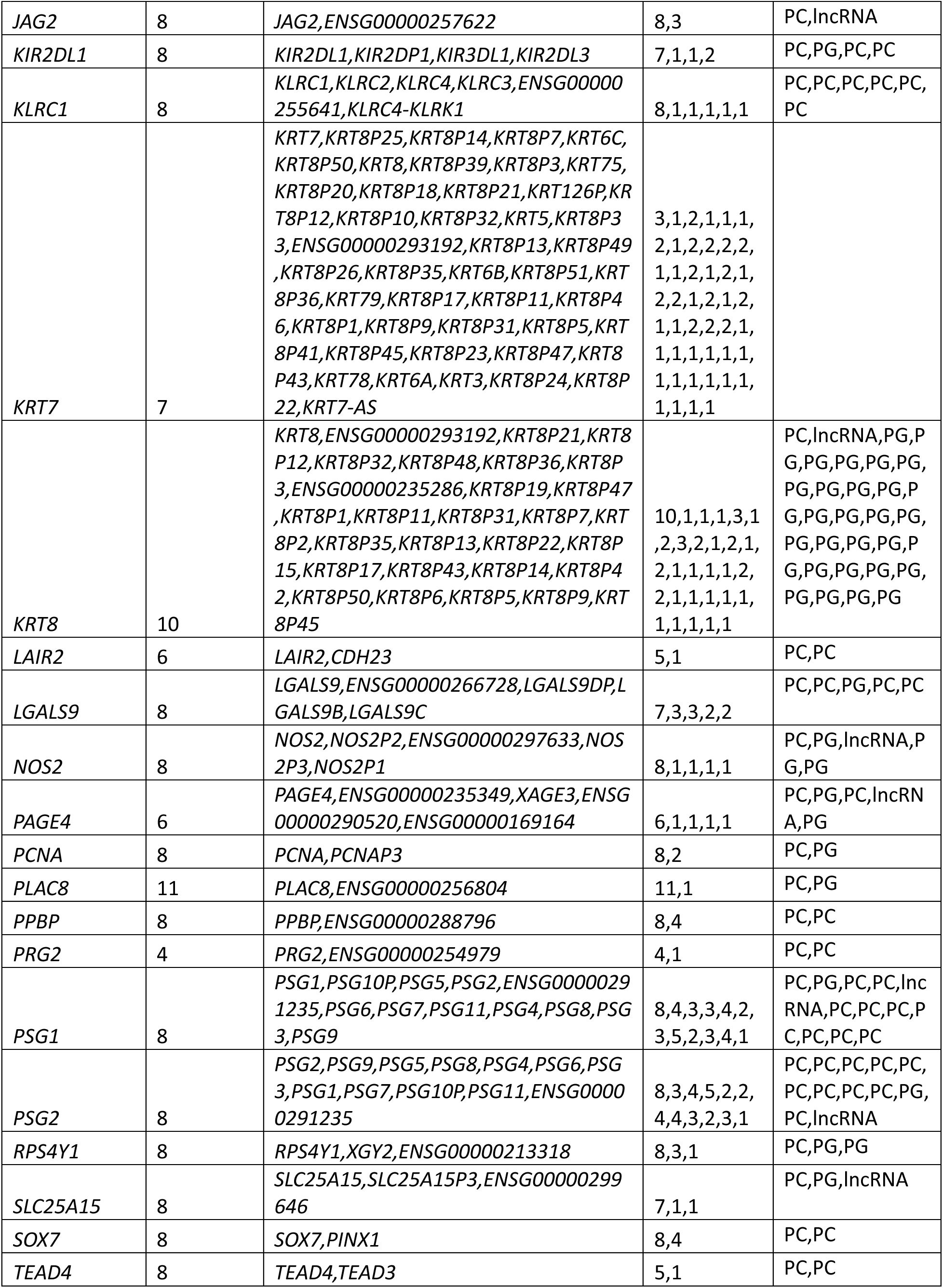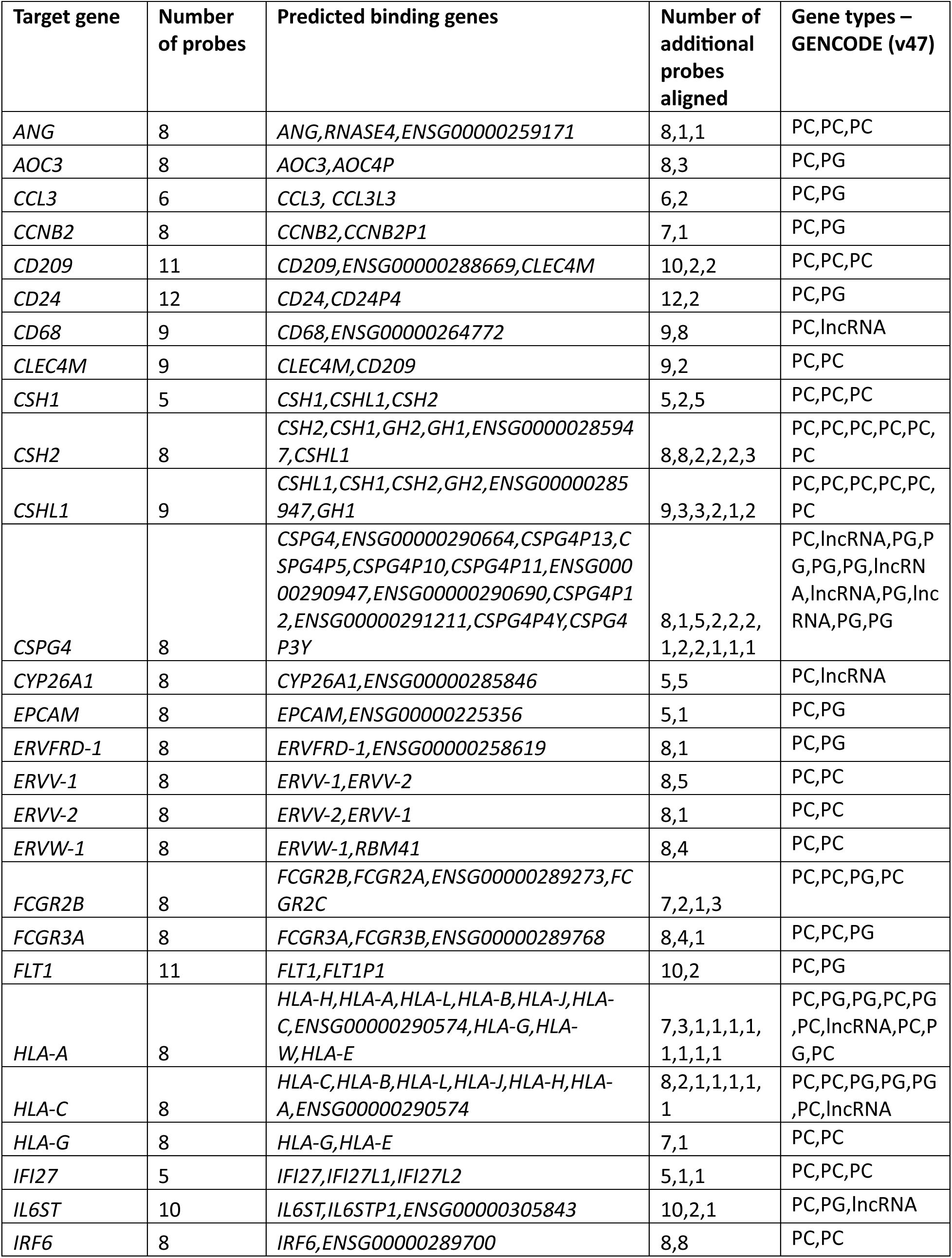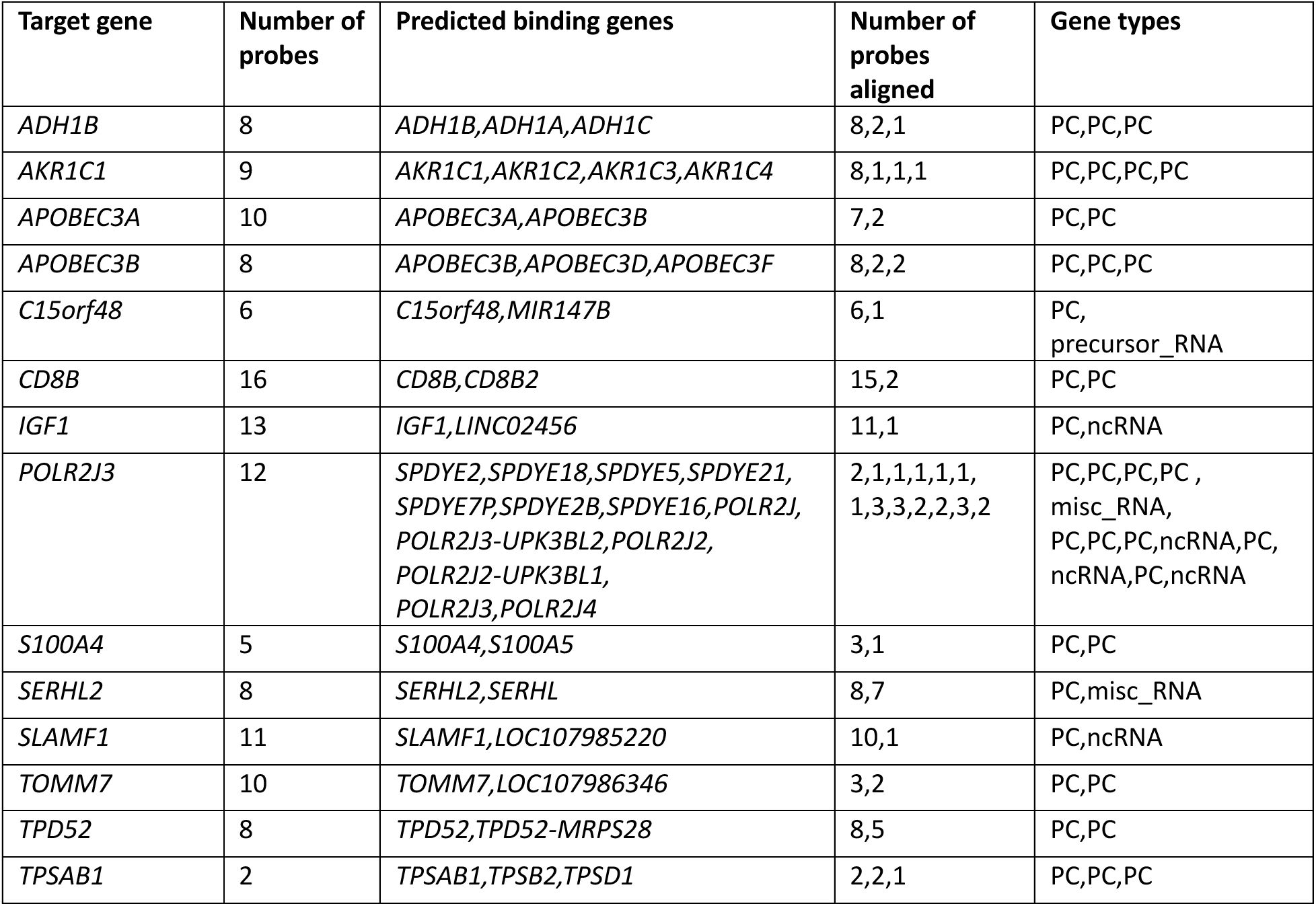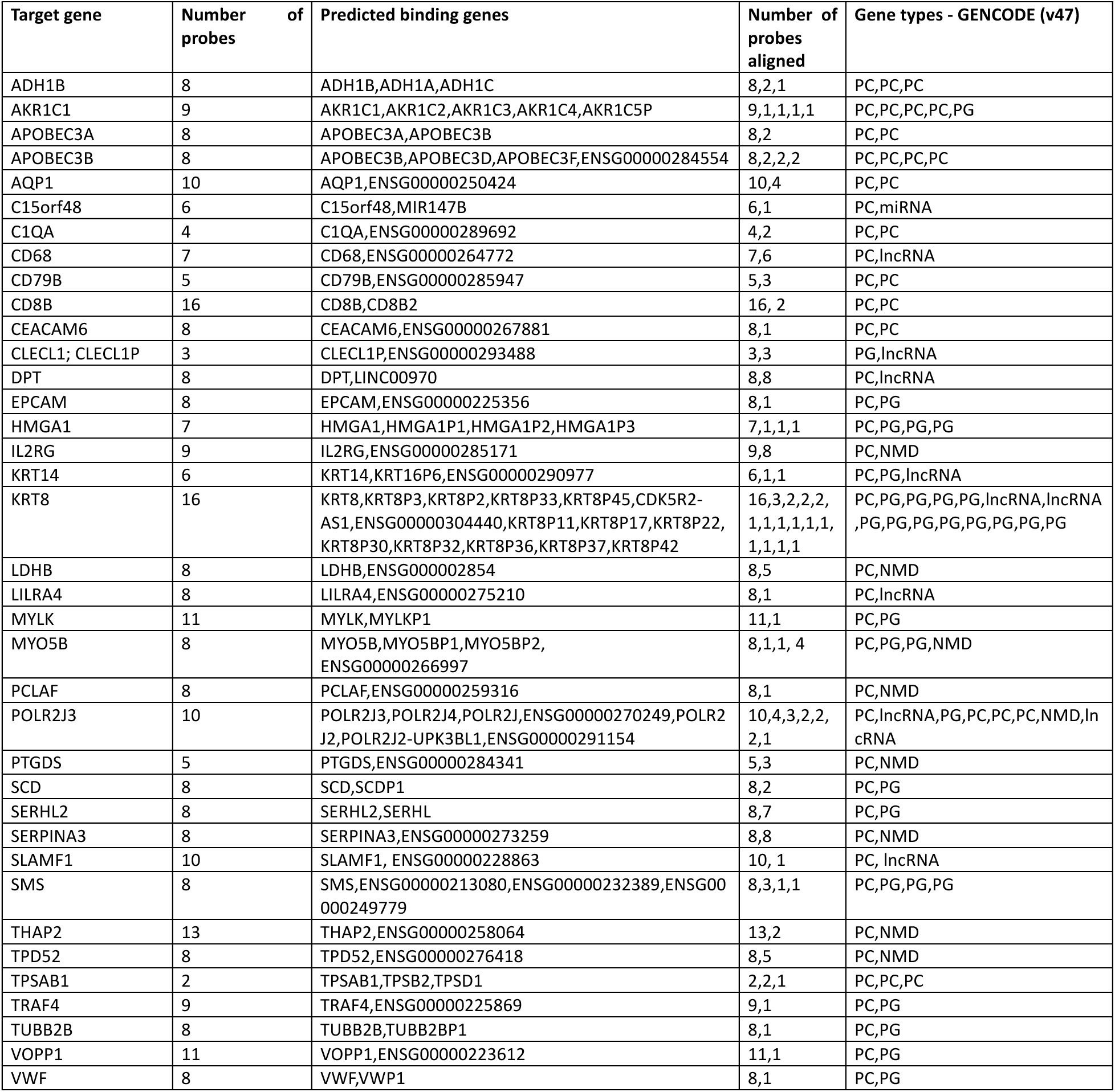 ). Among the 37 genes with predicted off-target binding, the number of affected probe sequences per gene ranged from 1 to 8. Overall, these off-target probes matched 71 other genes, including 20 protein-coding genes, 31 pseudogenes, 10 long non-coding RNA, 9 transcripts labeled as nonsense-mediated decay, and one microRNA gene.