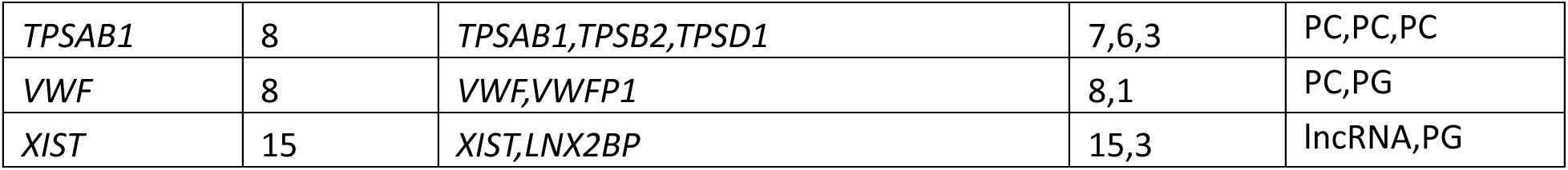 . The final column shows the gene types, in order, of each of the off-target genes shown in column 3. Abbreviations: PC = protein-coding; PG = pseudogene; NMD = nonsense-mediated decay; lncRNA = long non-coding RNA.