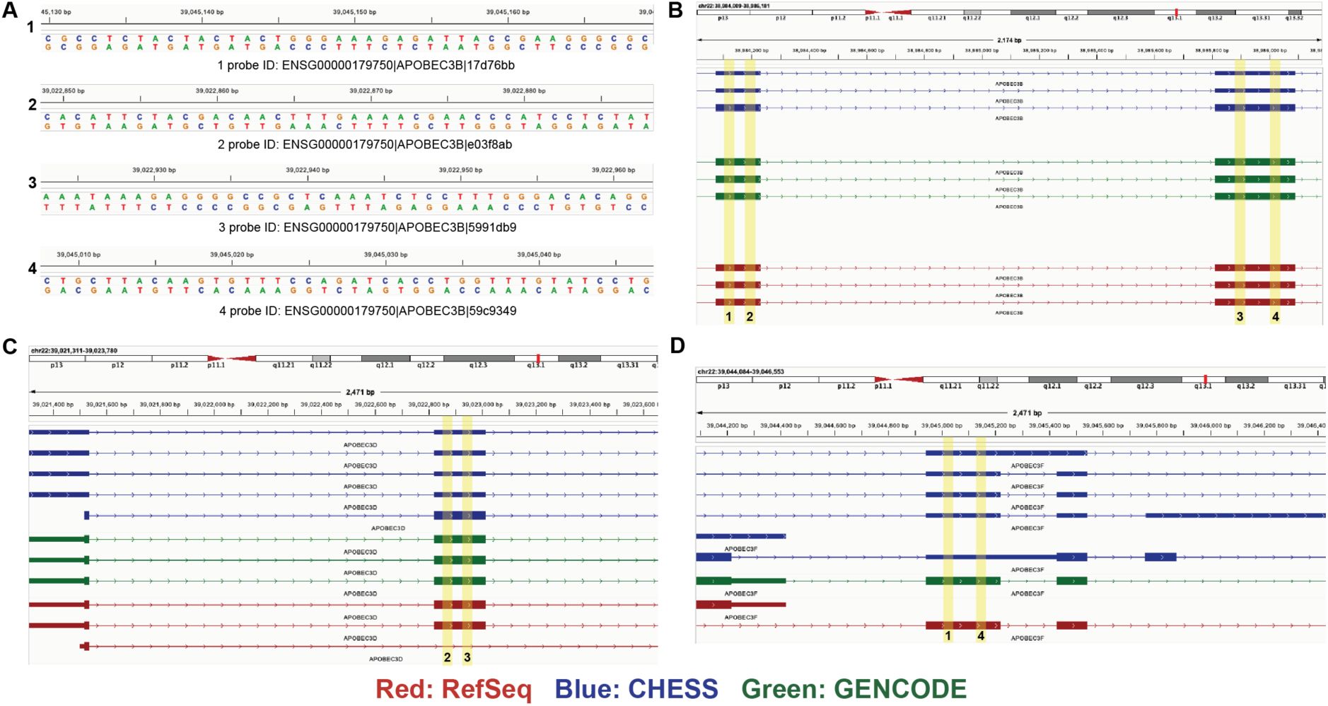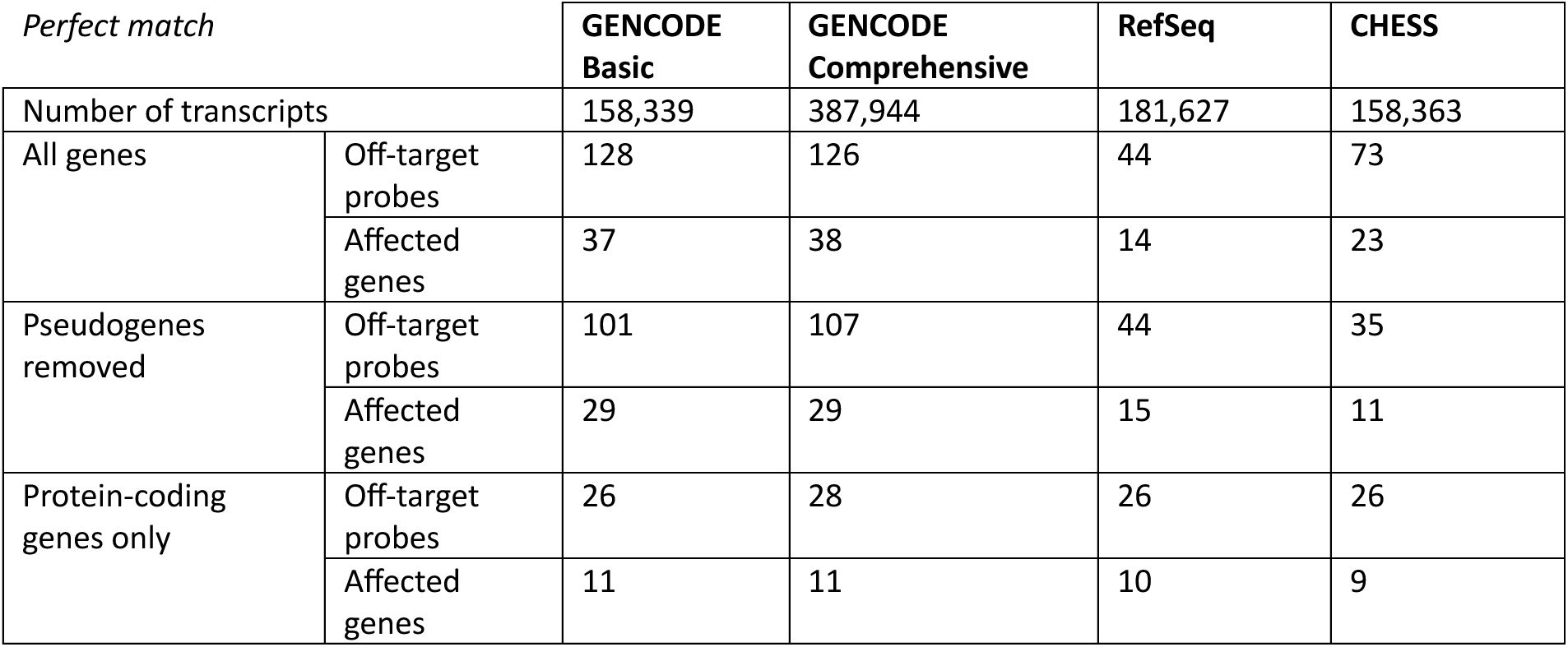 ). We reason that if a probe sequence aligns off-target to a protein-coding gene based on any of these annotations, it could result in off-target binding. We therefore focused further analysis on the union of genes with predicted off-target binding to protein-coding genes across the 3 annotations, resulting in 14 genes: