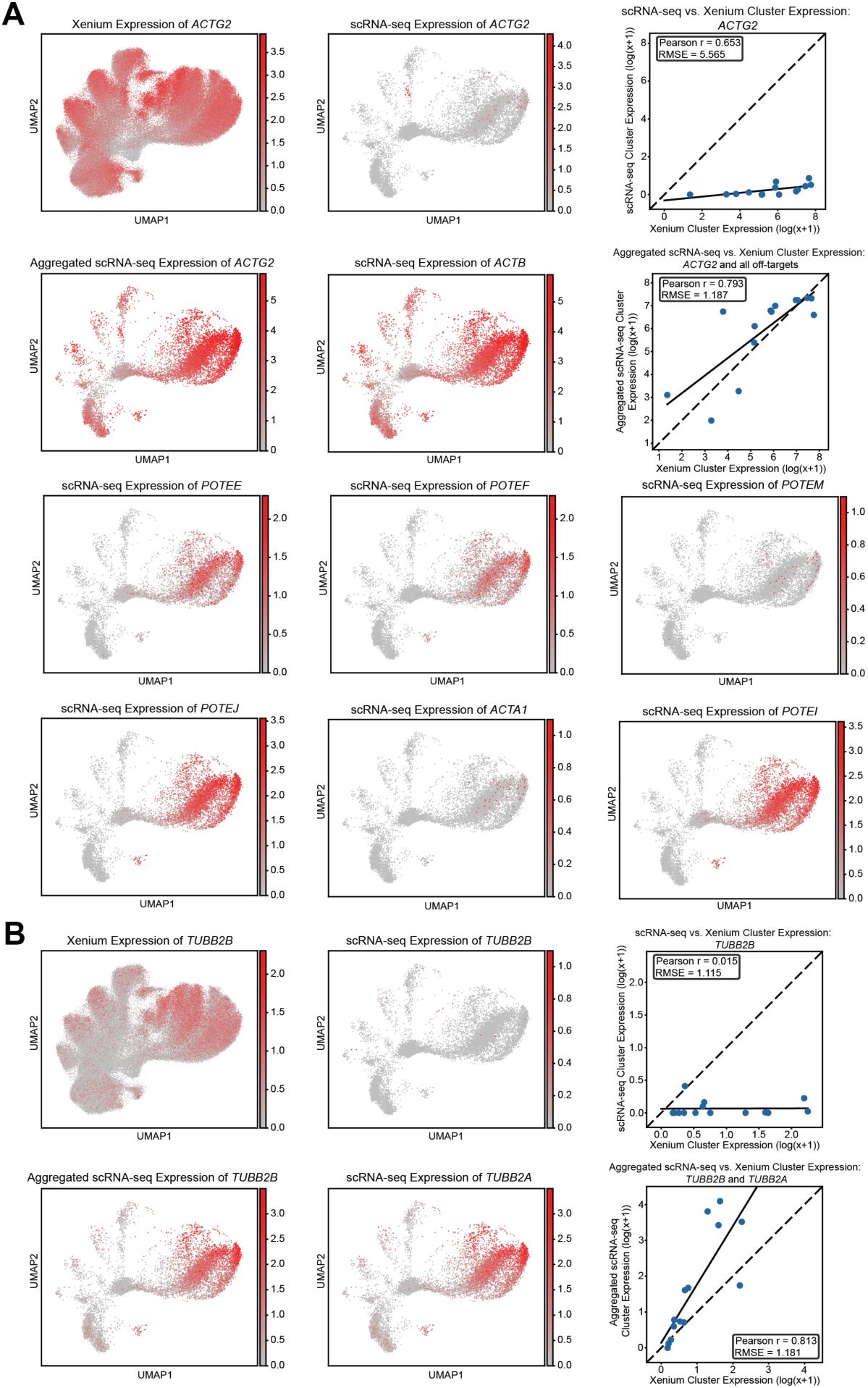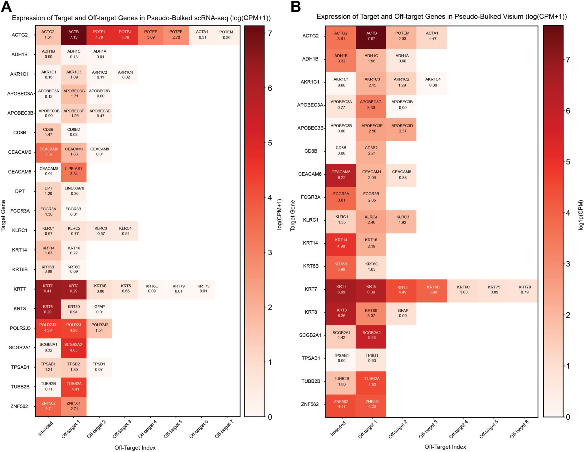 Among the 14 genes exhibiting off-target binding to protein-coding genes, 4 were present in the Visium dataset that had at least one corresponding off-target gene also detected in the dataset. For genes with no predicted off-target binding based on perfect sequence homology such as