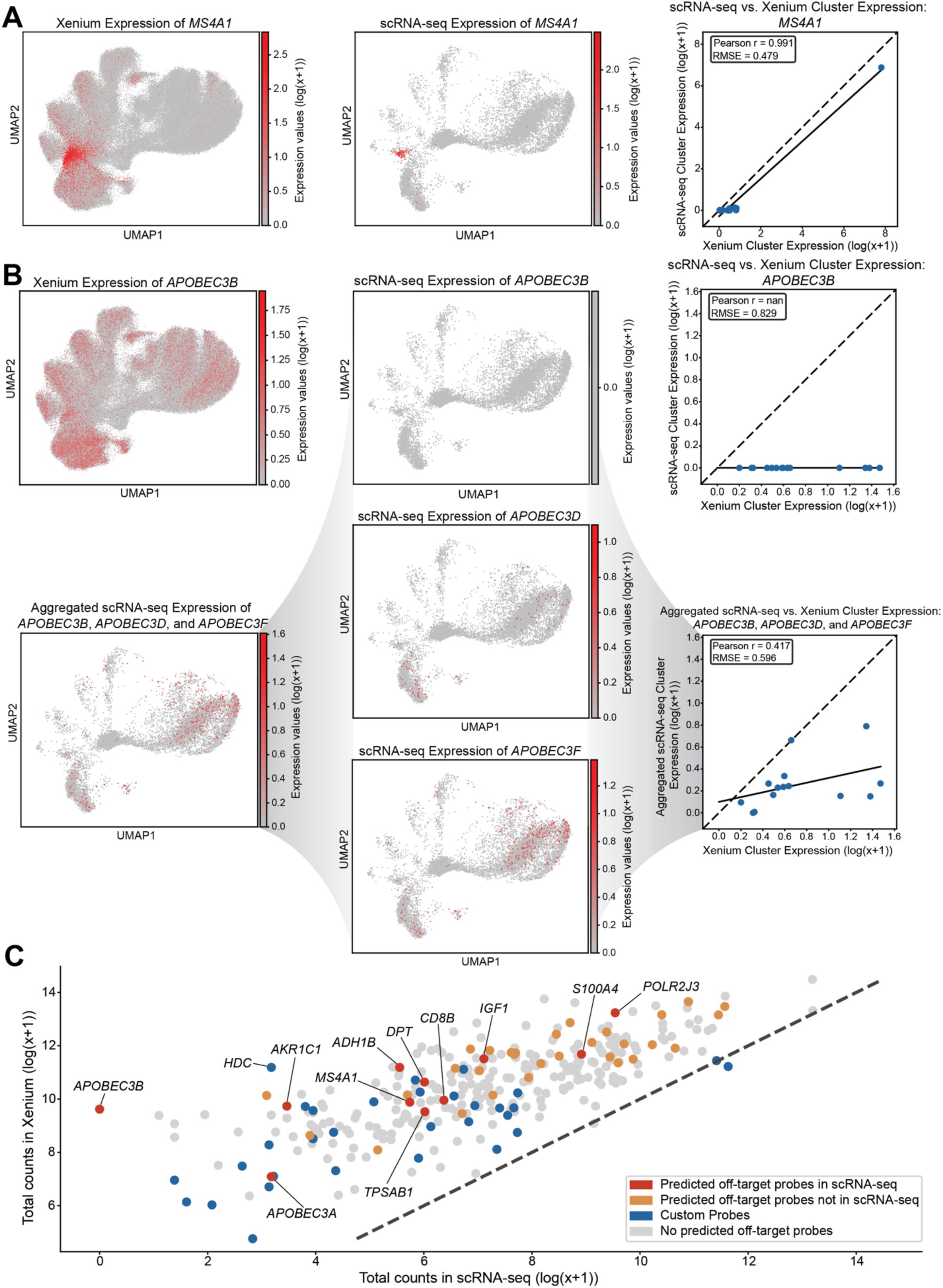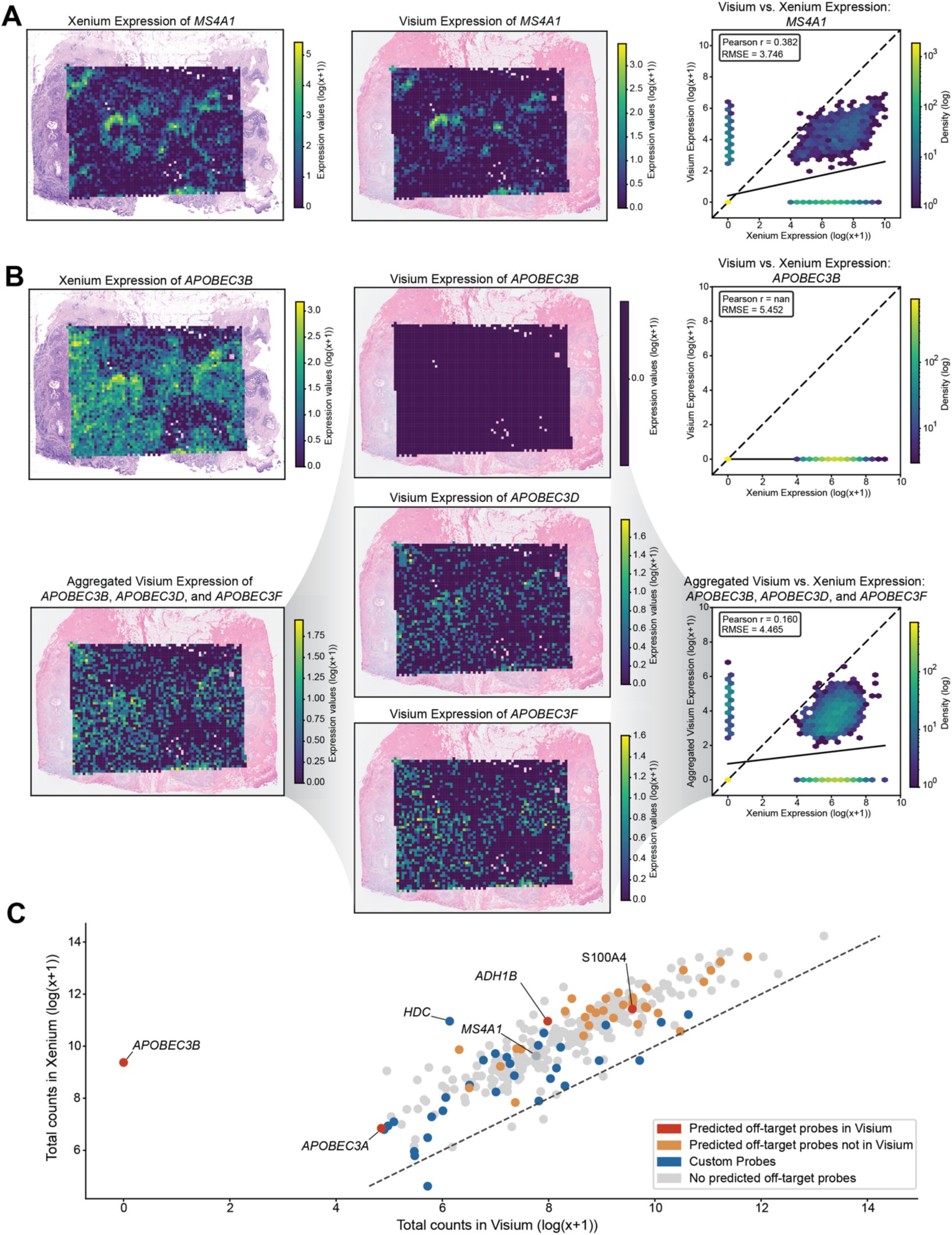 To investigate the potential effects of our predicted off-target binding for this Xenium human breast gene panel in experimental settings, we compared spatial gene expression patterns detected in two previously published spatial transcriptomics datasets from serial sections of the same breast cancer tissue: one section assayed with Xenium using this gene panel, and another assayed using Visium CytAssist, an orthogonal spatial transcriptomics platform (
