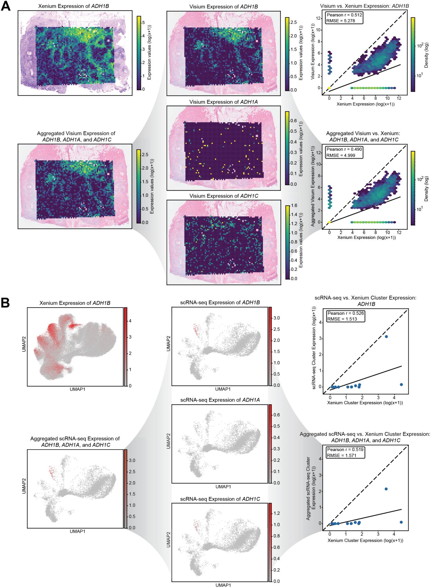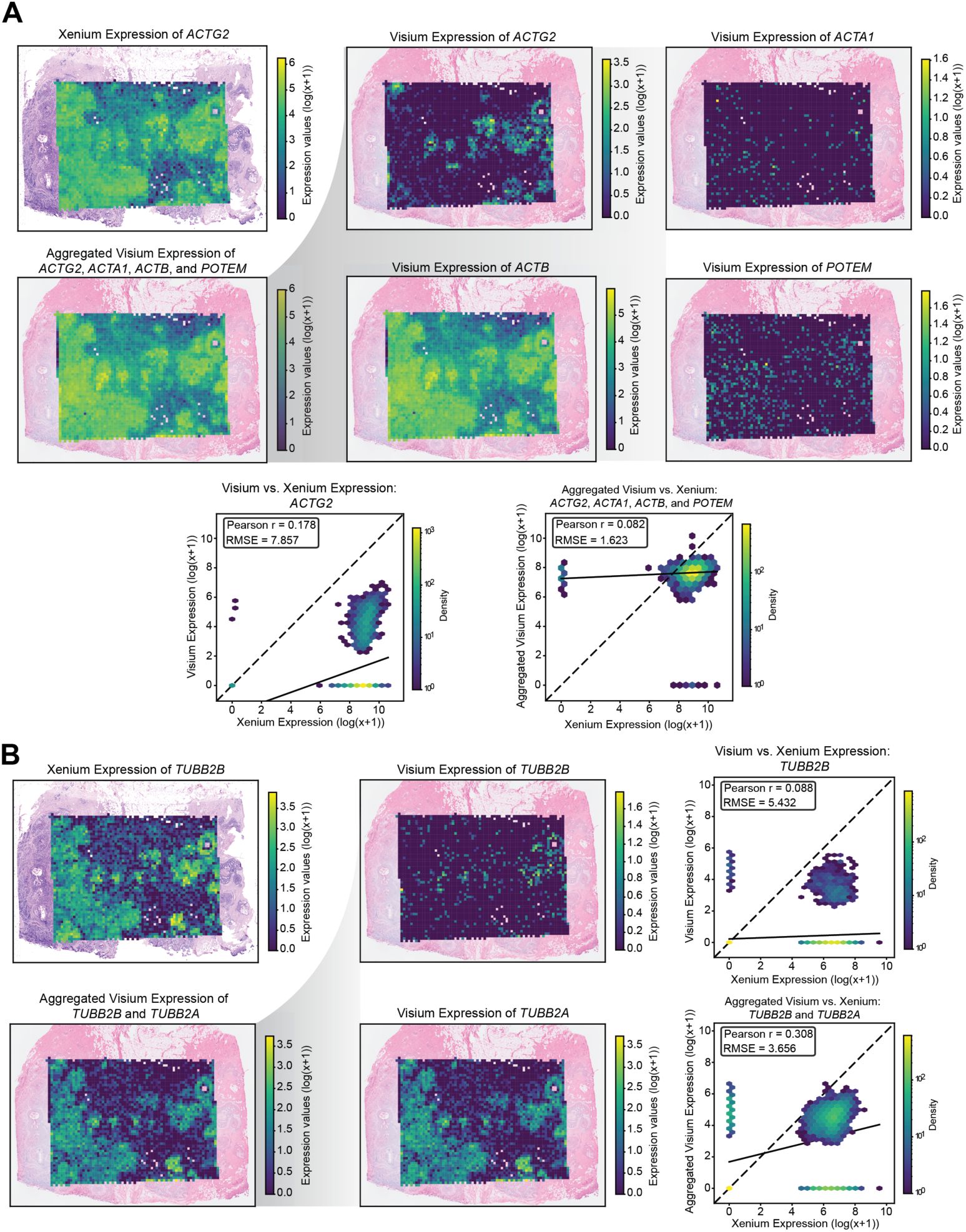 ), suggesting that spatially aligned groups of cells across the two technologies express this gene at comparable relative magnitudes. This can be quantitively assessed by comparing the pseudo-log gene expression values from both Visium and Xenium at matched spatial locations and computing the RMSE and Pearson correlation in a manner similar to STcompare (