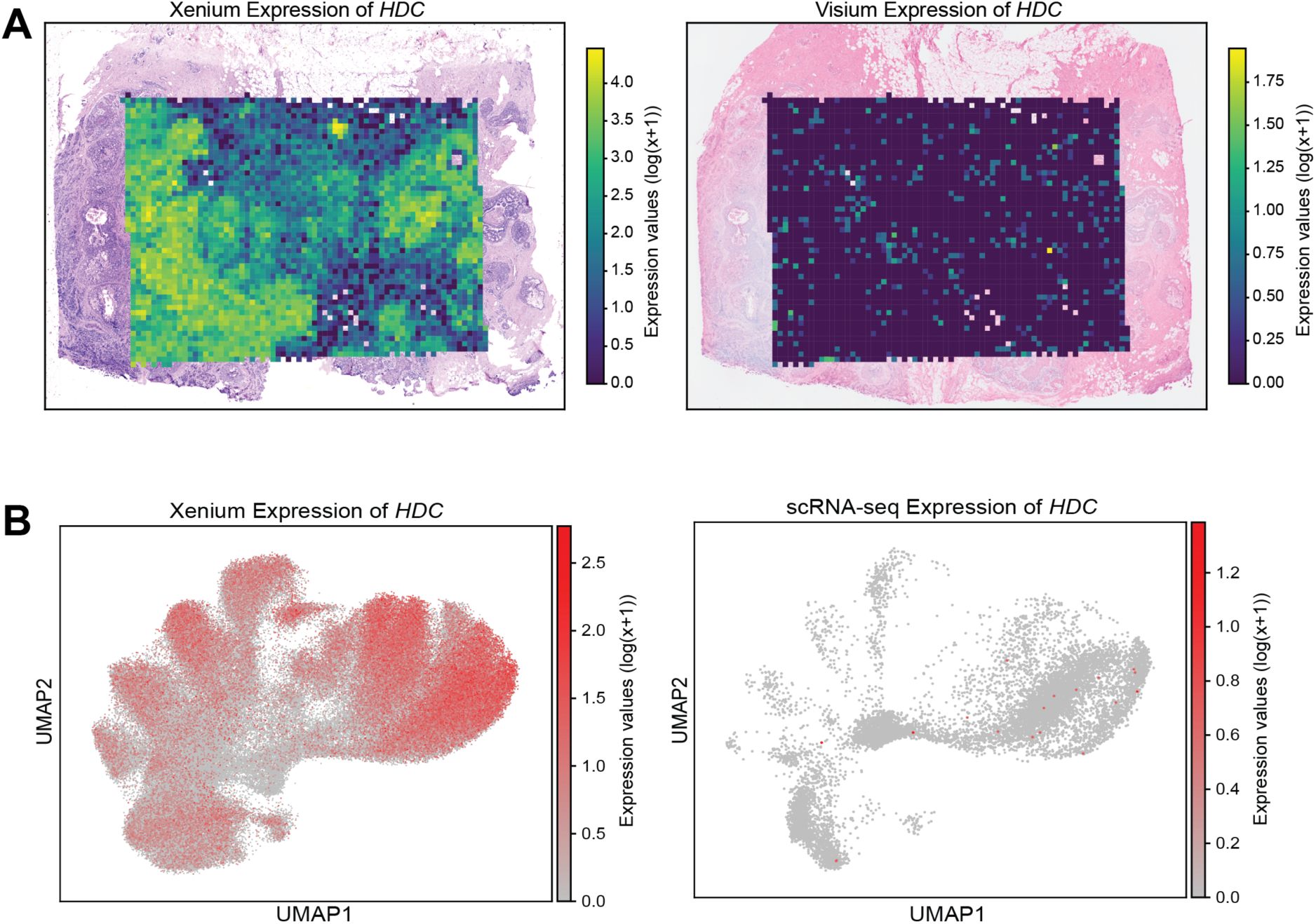 ). Briefly, Visium CytAssist is a sequencing-based spatial transcriptomics technology in which RNA is hybridized to spatially barcoded capture spots on a slide, enabling spatial transcriptomic mapping after sequencing. However, while Xenium offers single-cell resolution gene expression quantification, Visium quantifies gene expression within 55μm spots. To enable direct comparison, we first structurally aligned the Xenium and Visium tissue sections using STalign (