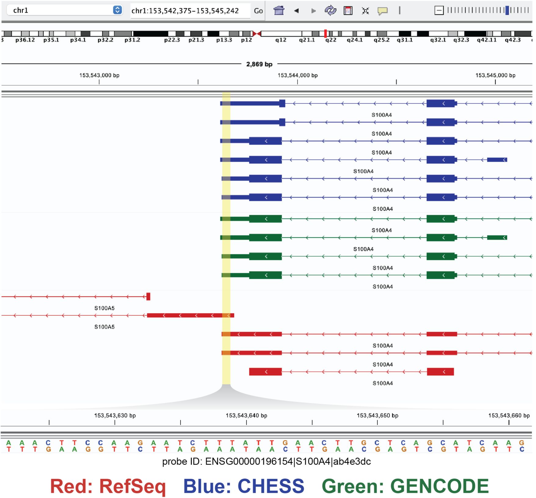 ). Again, these discrepancies reflect annotation differences. For example, the probe sequence (ENSG00000196154|S100A4|ab4e3dc), which was designed to target
