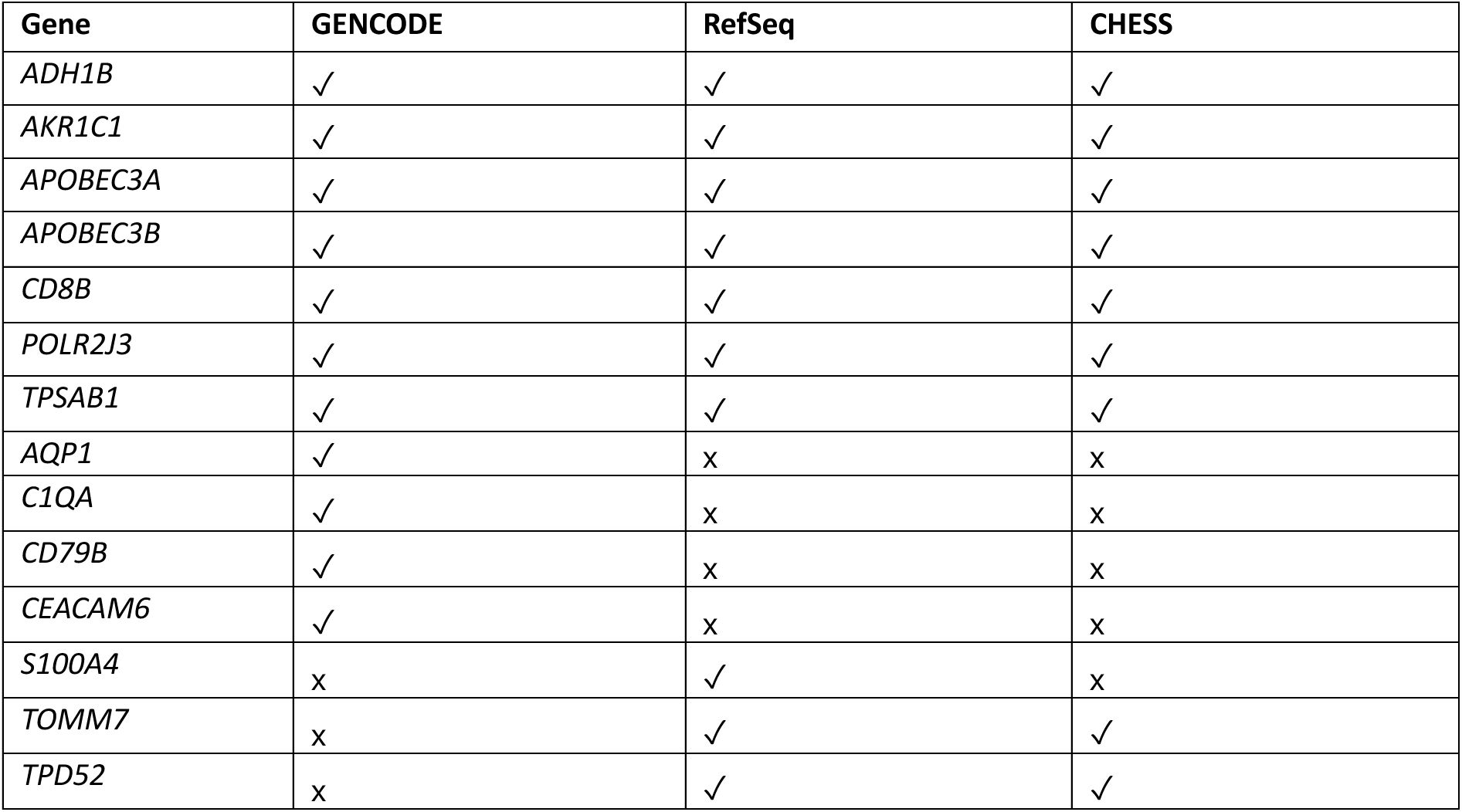 When considering only perfect sequence homology, while we previously found 37 affected genes using GENCODE, we found 14 when using RefSeq and 23 when using CHESS (