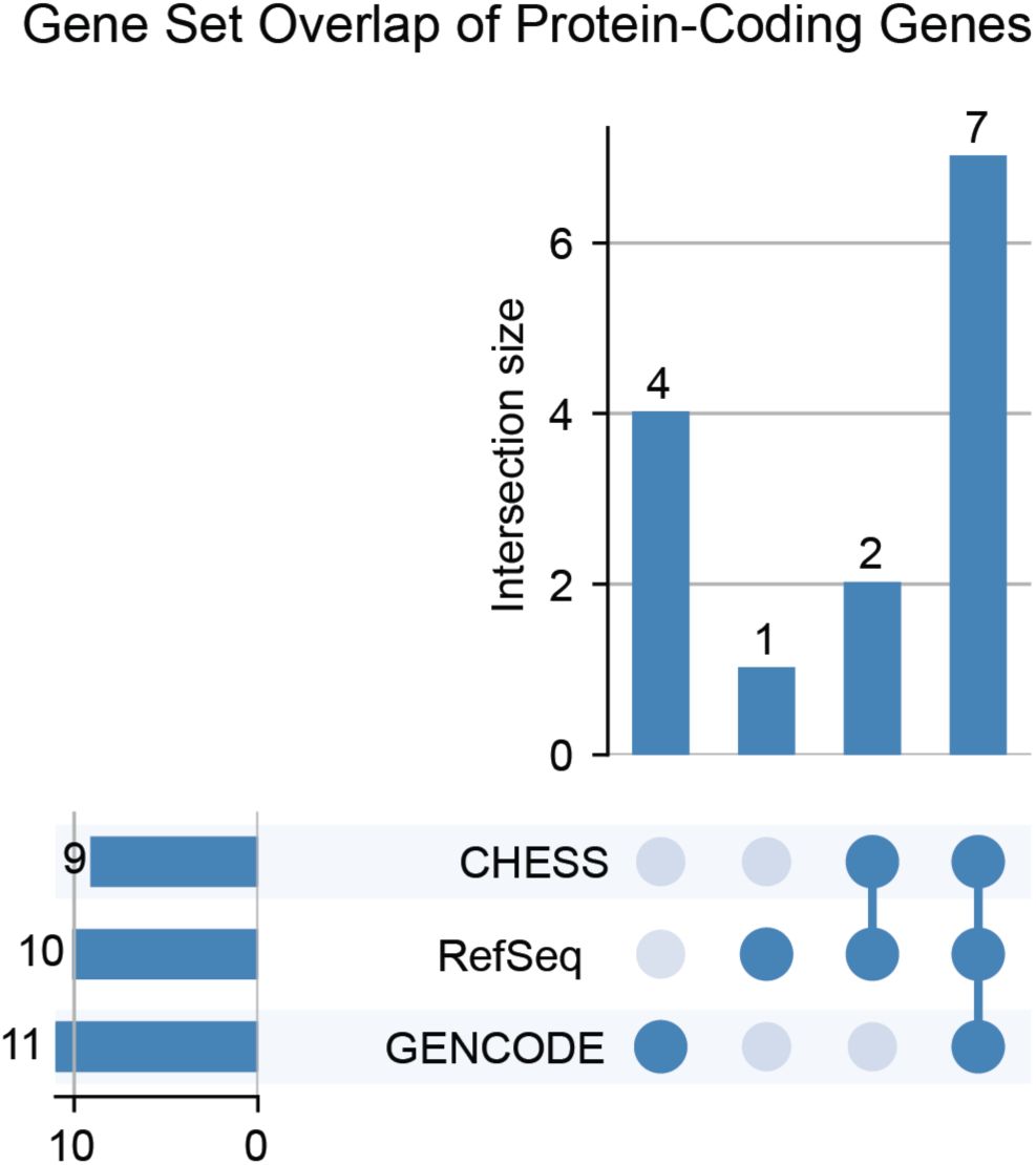 While the human annotation databases mostly agree on the number of protein-coding genes in the genome, they remain widely divergent on pseudogenes and lncRNA genes. Therefore, we focused on how the results change when we restrict our analysis to only protein-coding genes. By excluding pseudogenes (which are presumably not expressed), lncRNAs, and other non-protein-coding RNAs when using OPT, the number of affected genes fell to 11 for GENCODE, 10 for RefSeq and 9 for CHESS (