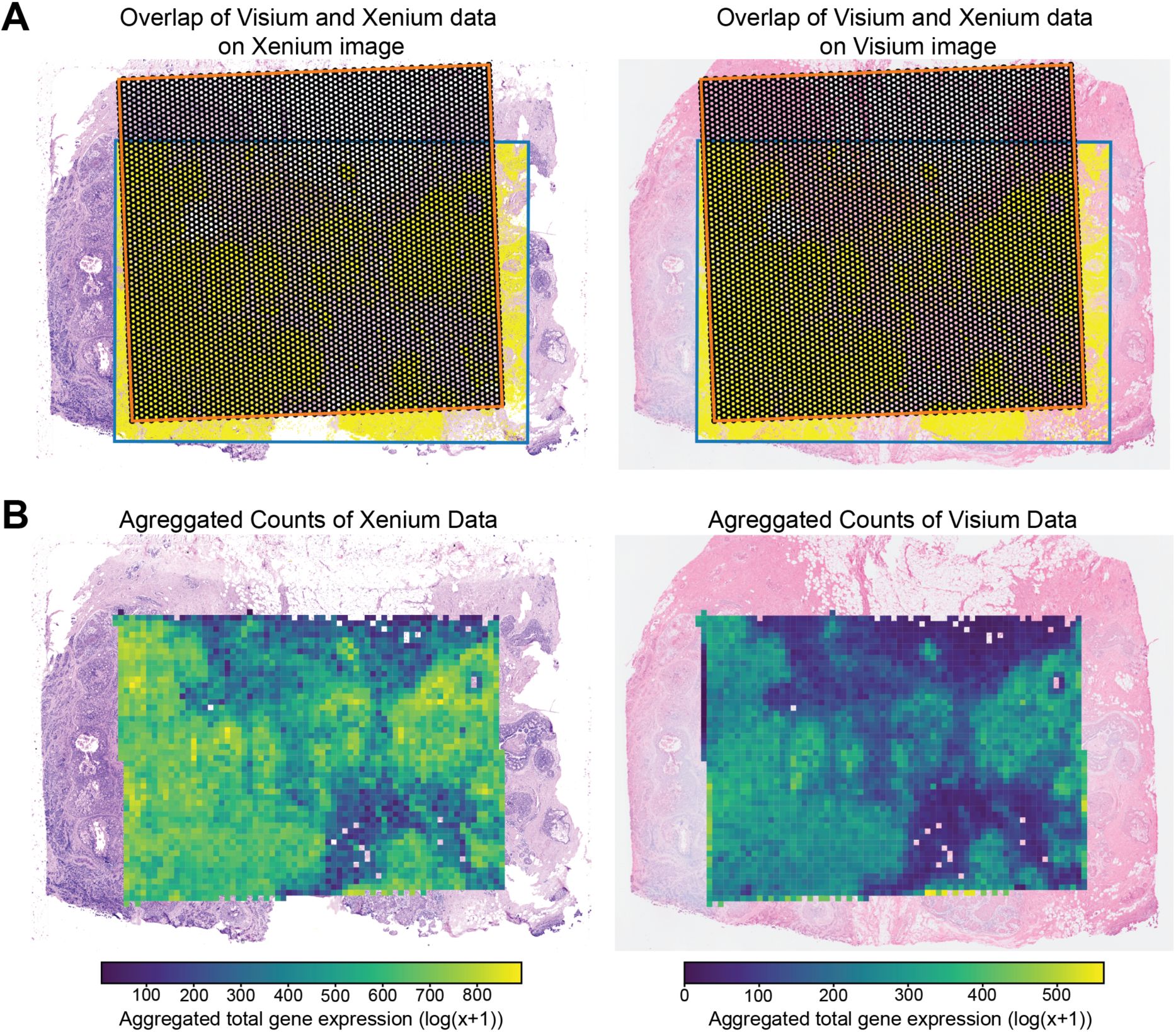 ). To improve visual comparability, we aggregated the Xenium gene expression data at the aligned locations to match the Visium spatial resolution and visualized using resolution-matched tiles (