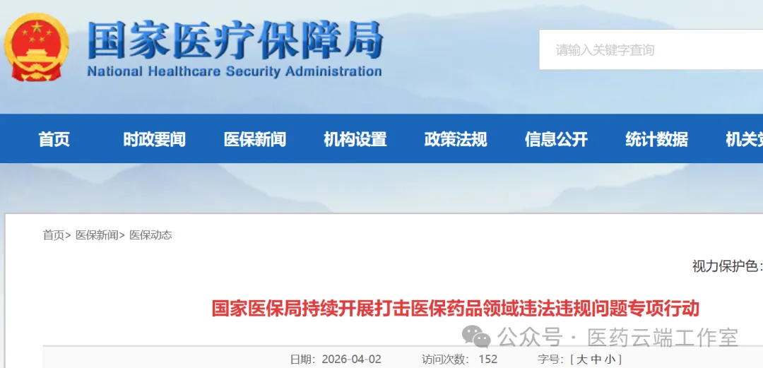 4月2日,国家医保局官网发出《国家医保局持续开展打击医保药品领域违法违规问题专项行动》,介绍了国家医保局发出通知,自2026年4月起,以药品追溯码疑点线索核查为抓手,在全国范围内继续深入开展打击医保药品领域违法违规问题专项行动。
