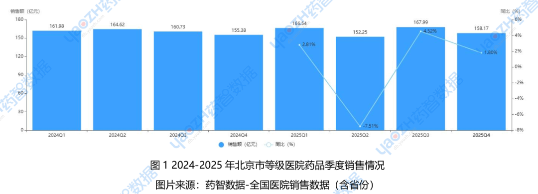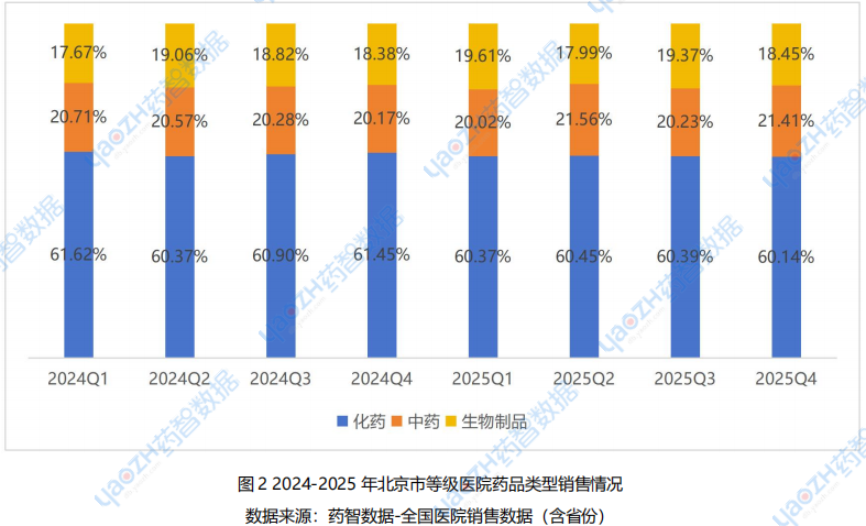 药智数据-全国医院销售数据(含省份)数据库显示,2024Q1-2025Q4北京市等级医院药品销售整体稳健,季度规模稳定在152-168亿元区间。2025年市场呈“先抑后扬”态势:Q2短期下滑后,Q3以167.99亿元创近两年季度销售新高,全年总规模达644.95亿元,同比微增0.35%。当前市场已充分适配集采等政策调整,刚性需求稳固,创新药快速放量成为推动市场回暖的核心动力。从药品类型来看,2025年北京等级医院药品销售格局呈现“化药主导、中药与生物制品协同补充”的鲜明特征。- 化药销售额达389.16亿元,占整体药品销售总额的60.34%,牢牢占据市场核心主导地位;