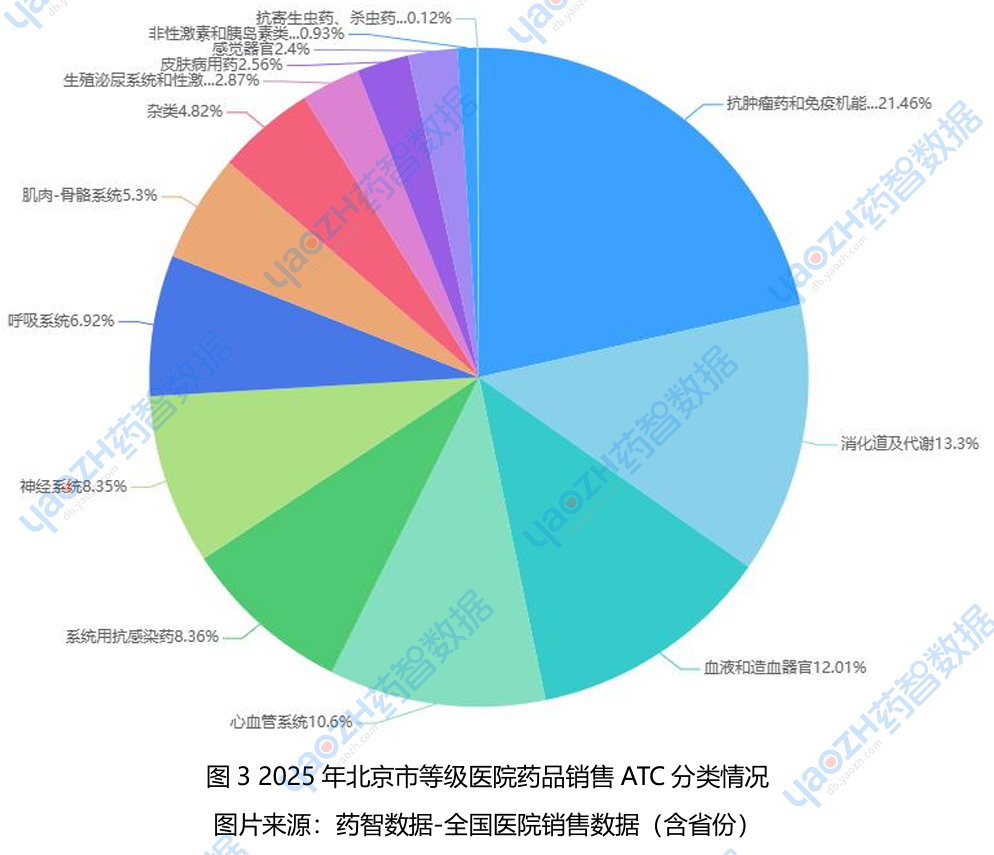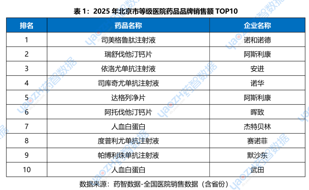 从ATC治疗领域分类来看,2025年北京等级医院药品市场抗肿瘤药和免疫机能调节药以21.646%占比位居榜首,消化道及代谢用药(13.3%)、血液和造血器官用药(12.01%)、心血管系统用药(10.6%)、系统抗感染用药(8.36%)、神经系统用药(8.35%)分别位居第2-6位。六大核心治疗领域药品合计市场份额占比超过70%,形成稳定的市场格局。从品牌销售额角度来看,2025年北京等级医院药品品牌TOP10销售额均超过3亿元,诺和诺德的司美格鲁肽注射液位居榜首,阿斯利康的瑞舒伐他汀钙片位列第二,安进的依洛尤单抗注射液位列第三。外资品牌霸屏,占据市场主导地位,国产品牌在高端药品市场仍有较大提升空间。国产创新药如何突围,将是未来市场关注的焦点。北京等级医院药品市场的稳健回升,为整个医药行业注入了信心。在创新药的驱动下,市场格局正在重塑。未来,随着更多国产创新药的上市和医保政策的支持,北京药品市场将迈向更多元、更具活力的发展新阶段。更多北京市等级医院药品销售情况,请前往药智数据企业版体验声明:本文仅作信息传递之目的,并不代表本平台观点。本文也不是治疗方案推荐,如需获得治疗方案指导,请前往正规医院就诊。如涉及作品内容、版权和其它问题,请在本平台留言,我们将在第一时间核实并处理。