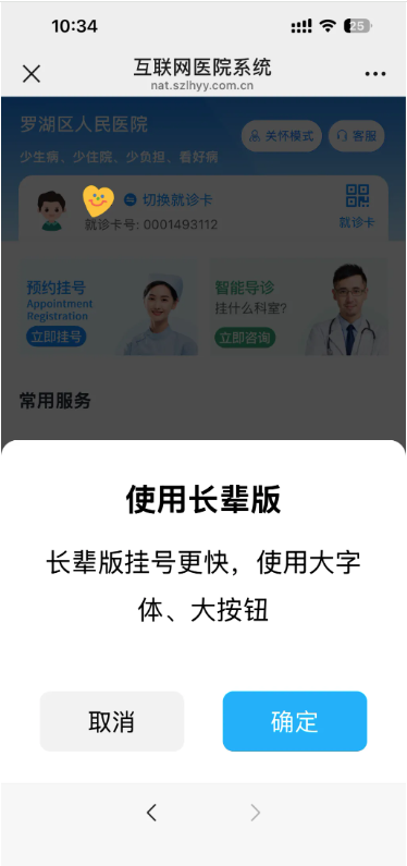 当患者使用互联网医院时,若系统识别患者年龄大于55岁,或者微信字体设置>=4号时,点击「预约挂号」,互联网医院会主动弹窗询问患者是否开启关怀模式。