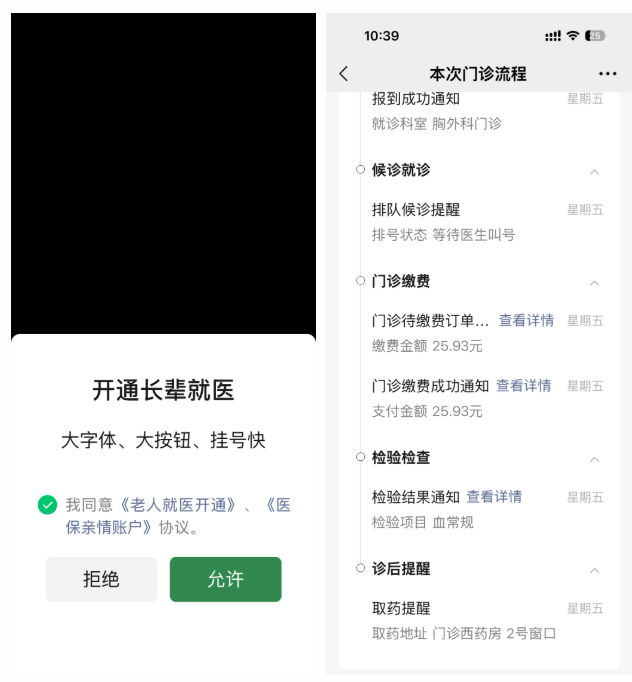 启用关怀模式后,患者开通「长辈就医」,从门诊叫号、药房取药到出具报告,全流程就医提醒都会实时推送至微信服务通知,让长辈看病更省心、家属更放心。