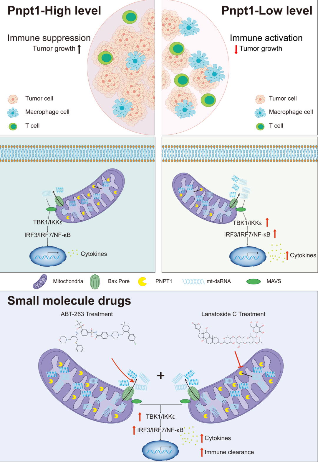 BH3模拟物是一类靶向Bcl-2家族蛋白的小分子药物,可有效激活肿瘤细胞线粒体凋亡通路,但目前主要局限于部分血液肿瘤的治疗。研究表明,采用PNPT1抑制剂阻断其降解mtRNA的功能,并与BH3模拟物联合应用,可产生显著的协同抗肿瘤效应。该联合策略中,PNPT1抑制剂解除对mtRNA通路的抑制,高效激活免疫应答;BH3模拟物则通过破坏线粒体膜完整性,进一步促进双链mtRNA的释放,强化免疫激活效果,同时直接诱导肿瘤细胞凋亡,实现“免疫激活与直接杀伤”的双重作用。